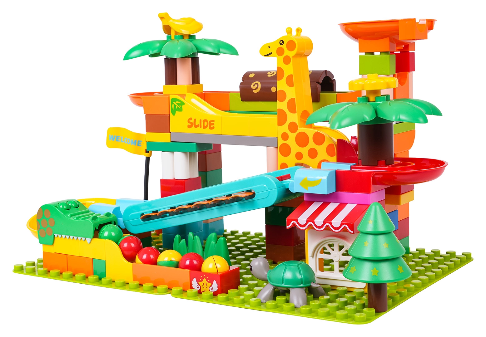Des rampes colorées, des entonnoirs et des toboggans avec des décorations de palmiers et d’animaux invitent à construire sans cesse de nouveaux parcours.