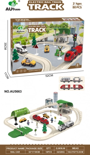 Ce circuit ferroviaire urbain détaillé offre aux enfants une expérience réaliste de la circulation en ville. Le set comprend des rails avec tunnel, un bâtiment de gare, un passage à niveau avec barrières, un feu de signalisation, des bâtiments, des panneaux routiers, deux trains et d’autres accessoires. Les effets lumineux et sonores animent chaque trajet – le train klaxonne, ses phares avant s’allument, le tunnel clignote et la gare est rétroéclairée.