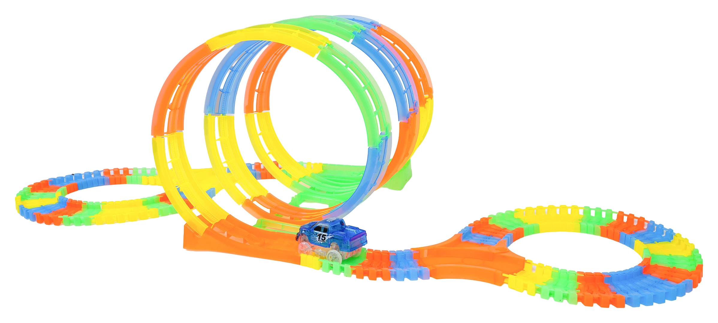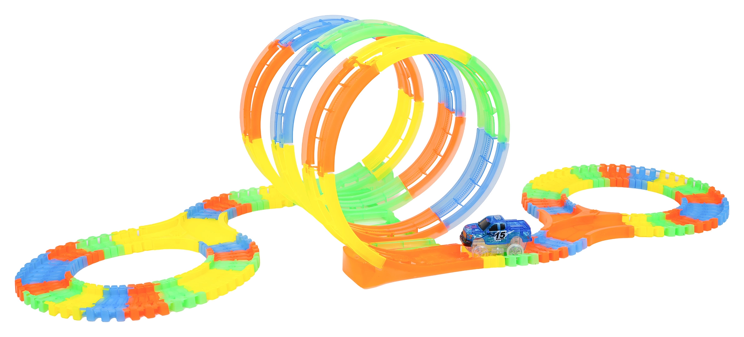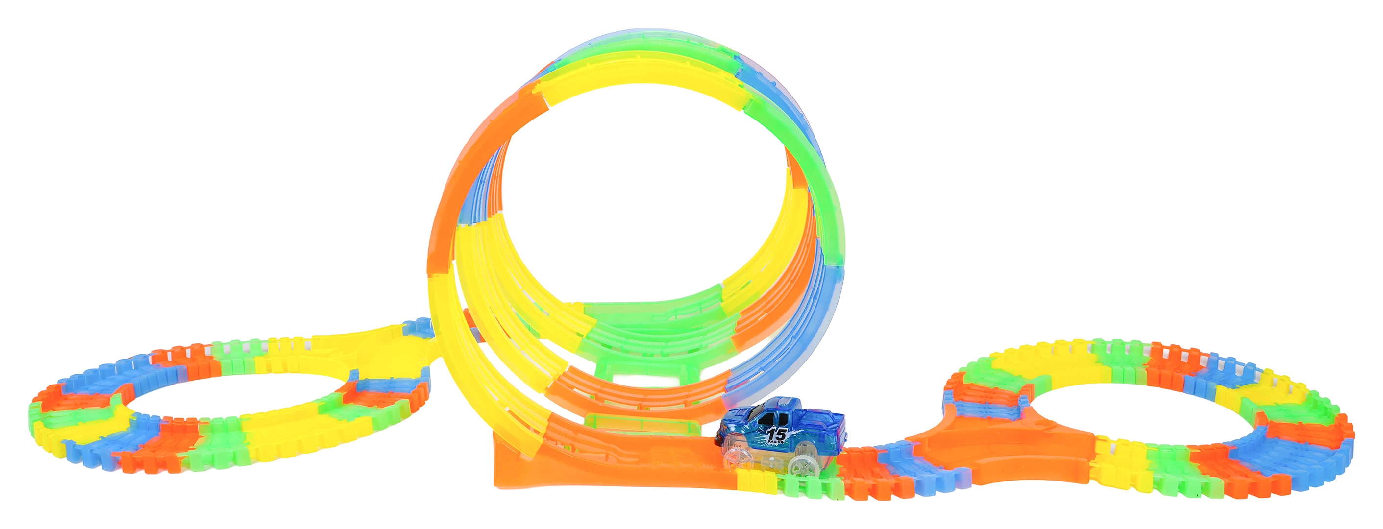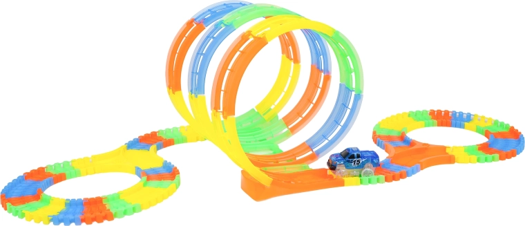 Ce circuit coloré offre aux enfants une construction créative et une conduite dynamique. Grâce aux éléments élastiques à clipser, des loopings, virages et ponts prennent forme en un instant et peuvent être reconfigurés à tout moment – même pendant la course. Le design fluorescent de la piste et le rétroéclairage LED de la voiture créent un superbe spectacle lumineux dans l’obscurité.