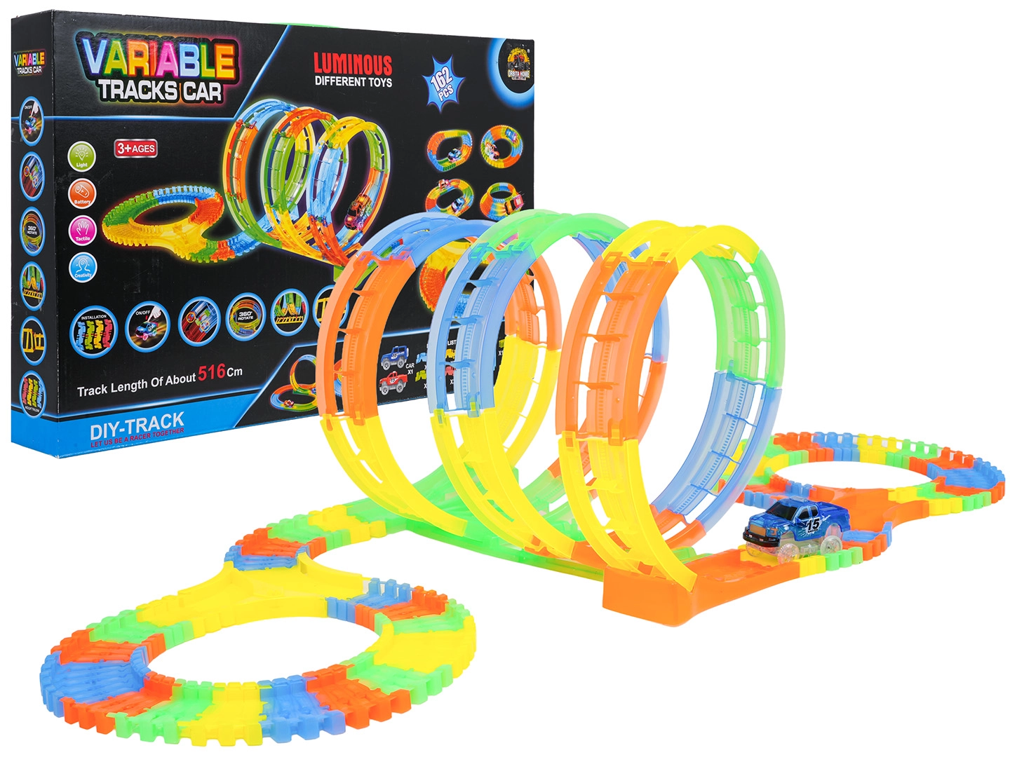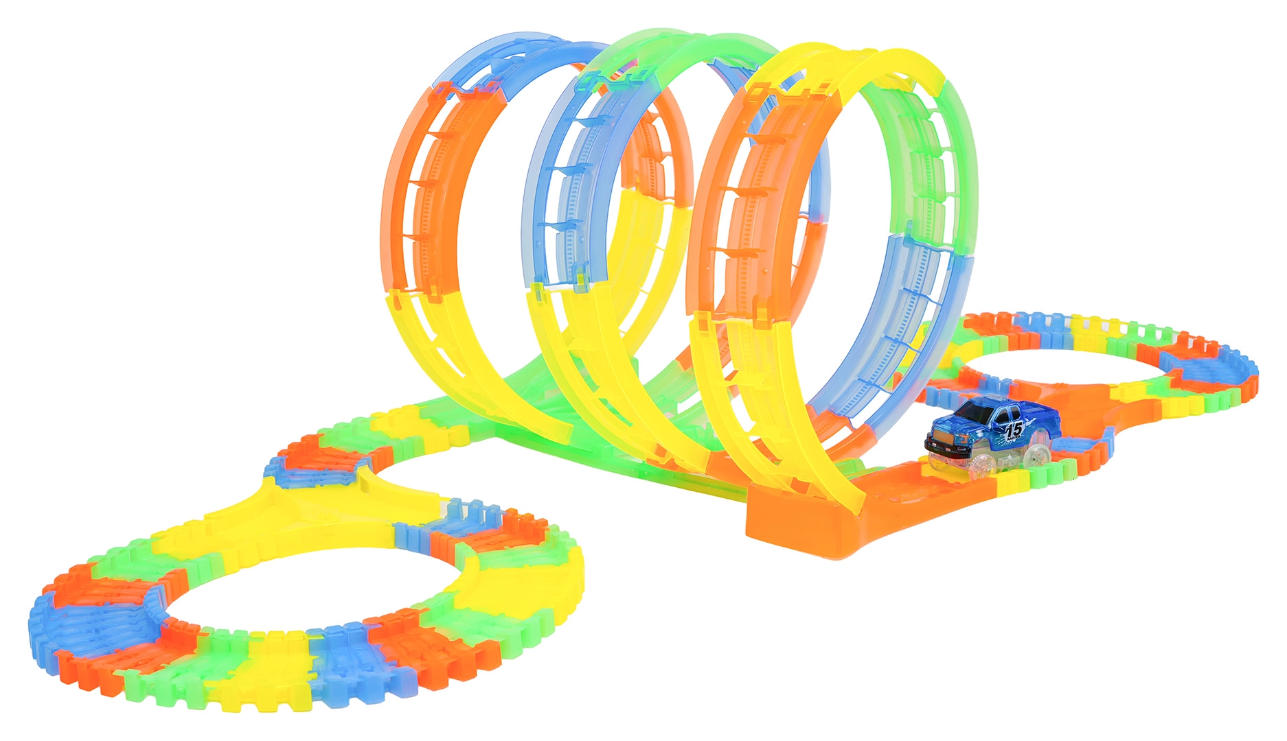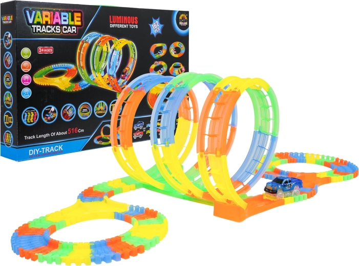 Ce circuit coloré offre aux enfants une construction créative et une conduite dynamique. Grâce aux éléments élastiques à clipser, des loopings, virages et ponts prennent forme en un instant et peuvent être reconfigurés à tout moment – même pendant la course. Le design fluorescent de la piste et le rétroéclairage LED de la voiture créent un superbe spectacle lumineux dans l’obscurité.