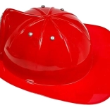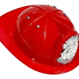 Casque rouge pour enfant avec rivets d’aération et emblème, offrant un port confortable et complétant parfaitement un costume de pompier.