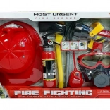 Le coffret comprend un casque, un masque, un embout de tuyau, un petit hachoir, un pied-de-biche, un extincteur manuel, un talkie-walkie et une montre. Le set est livré dans un emballage cadeau avec fenêtre, une excellente idée de cadeau pour les petits passionnés de pompiers.