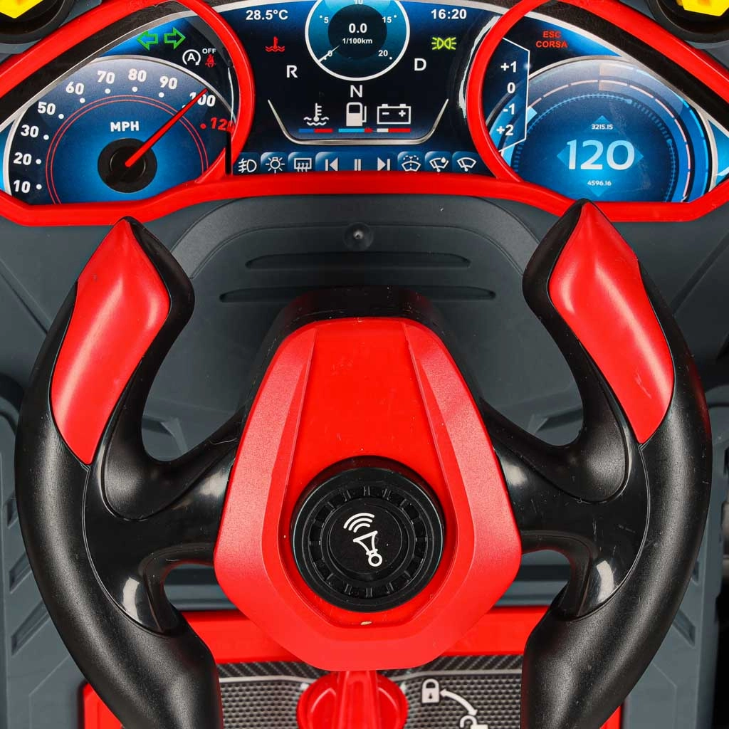 Sons de moteur et de klaxon, lumières clignotantes, bouton de démarrage et feu d’urgence transforment la chambre des enfants en véritable atelier auto.