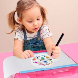 Le set comprend 6 planches de motifs (72 images au total), un assortiment de 12 crayons de couleur et 12 feutres. La table possède des compartiments de rangement intégrés et une plaque de protection transparente. Idéal pour les enfants à partir de 3 ans, il développe la motricité fine, la concentration et l’imagination.