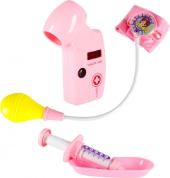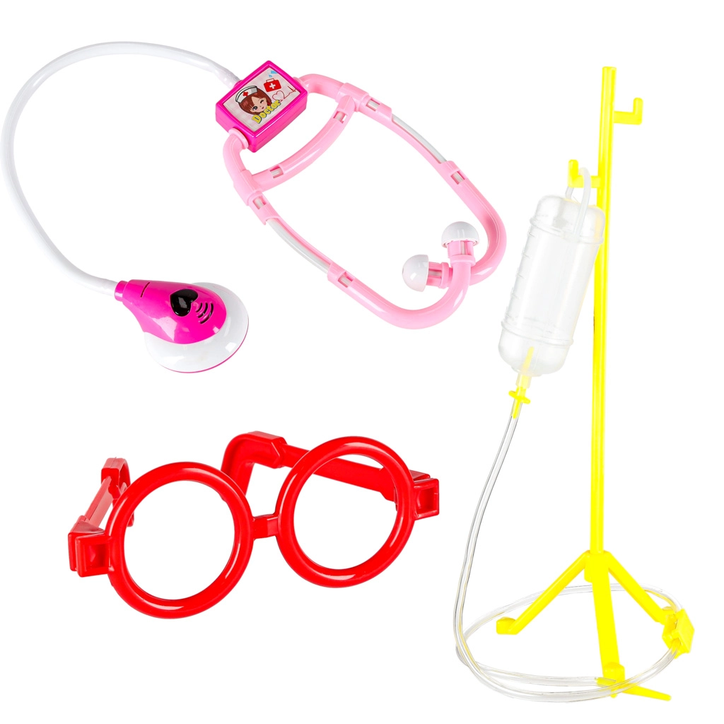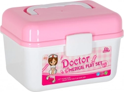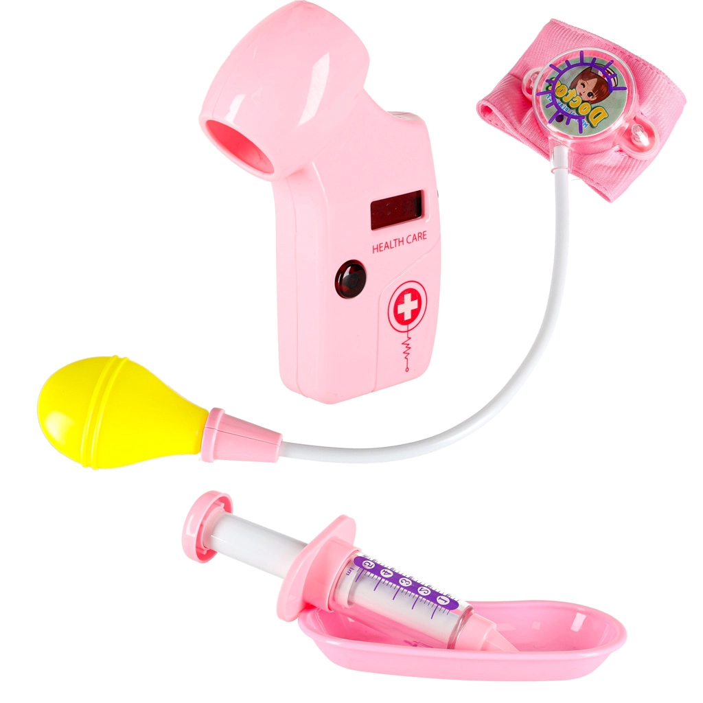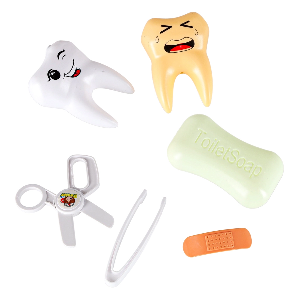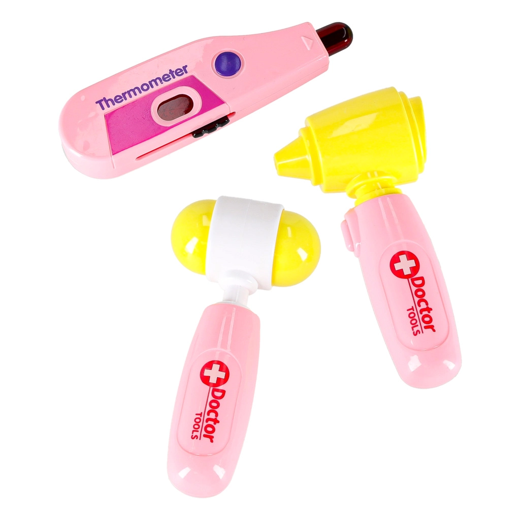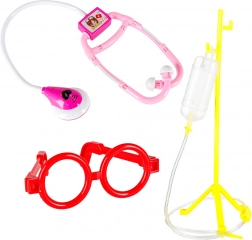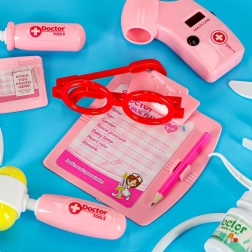 - blouse et coiffe de médecin, mallette à poignée avec fermeture, pied à perfusion pliant, tensiomètre pliant avec poire, badge nom, planchette avec pince et crayon, stéthoscope pliant, otoscope, lampe, thermomètre, oxymètre de pouls, miroir dentaire, « foreuse », « seringue », dent jaune « gâtée », dent blanche avec plombage, dentifrice et brosse à dents, marteau neurologique, savon et boîte, scalpel (jouet), pince, ciseaux, 2× boîte à médicaments, 2× boîte en forme de capsule, cuillères, pansement, lunettes, notice