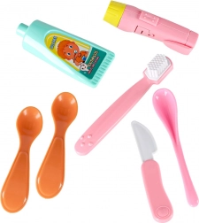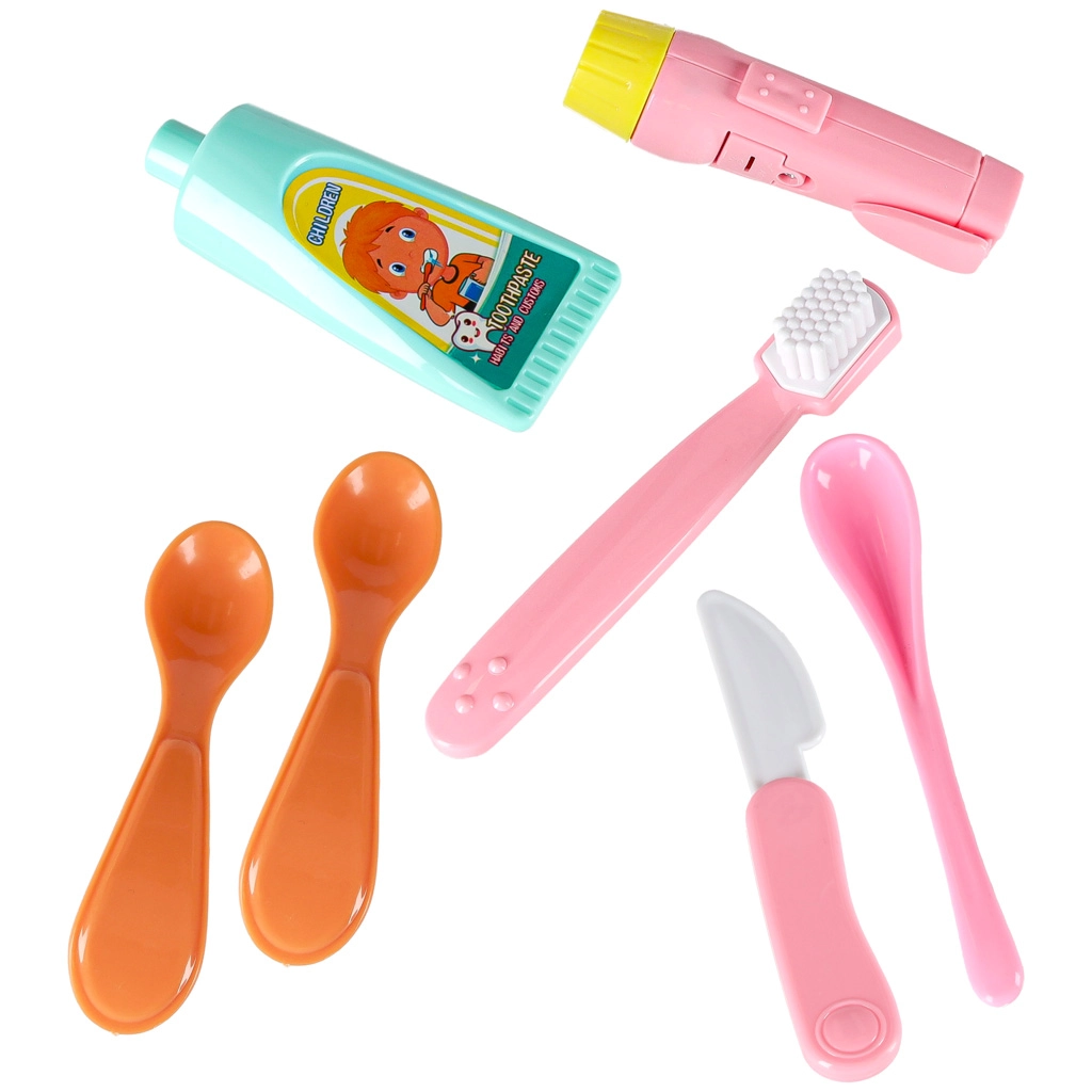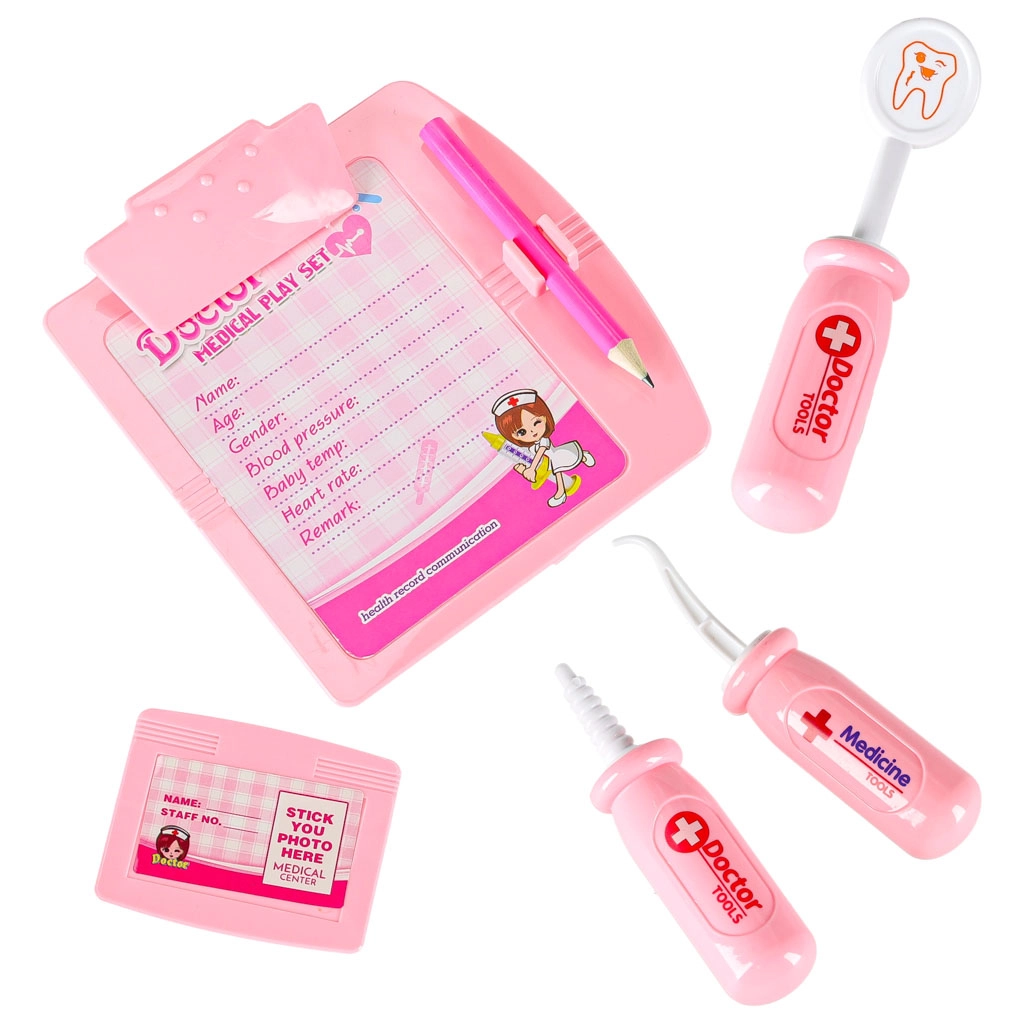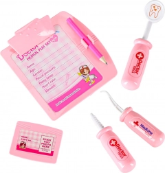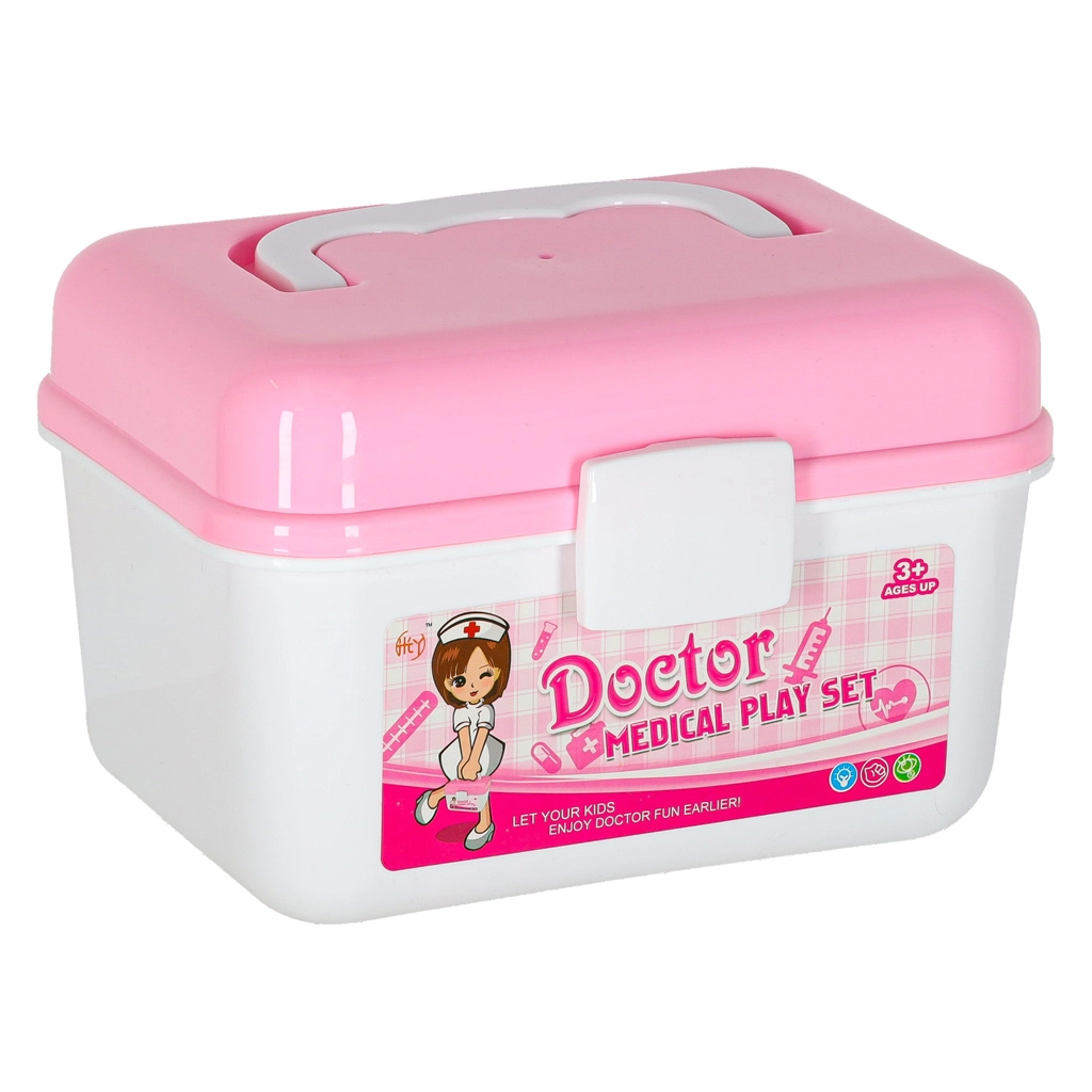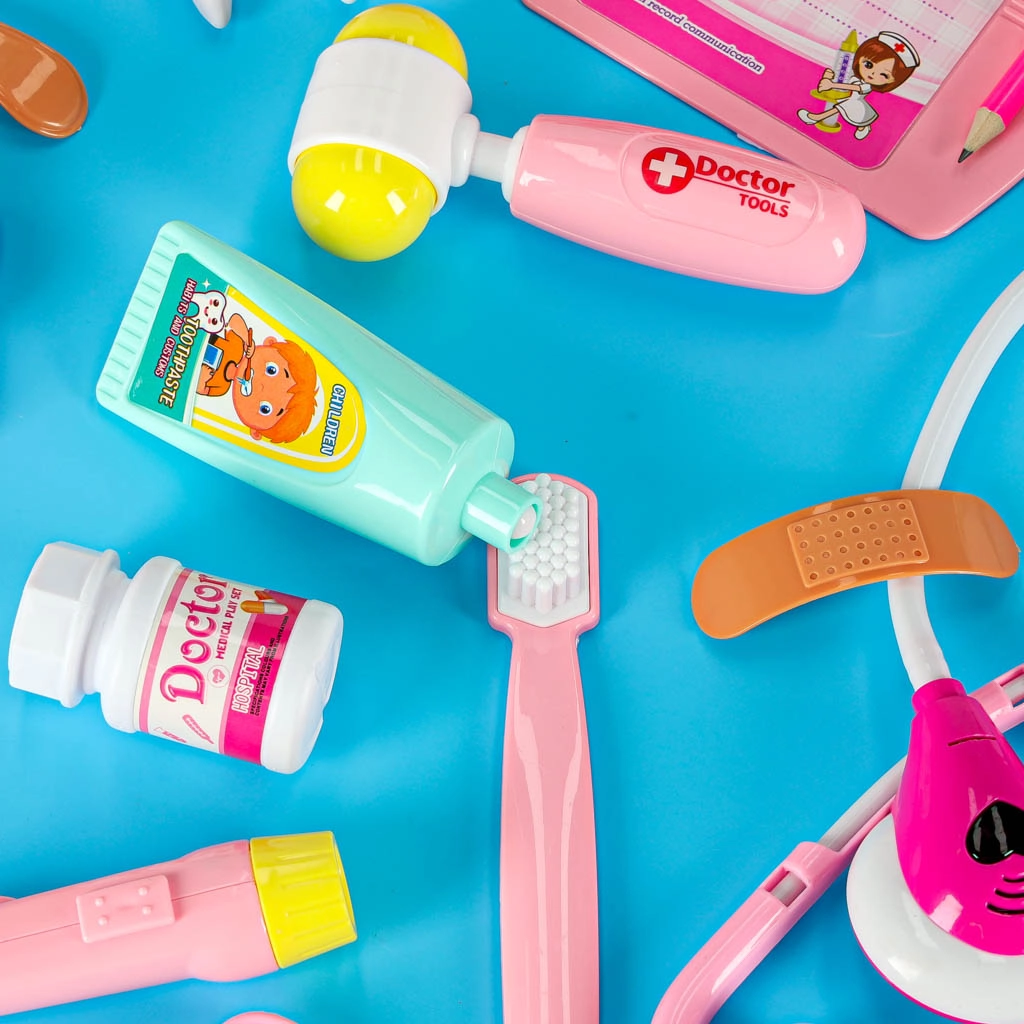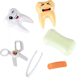 - blouse et coiffe de médecin, mallette à poignée avec fermeture, pied à perfusion pliant, tensiomètre pliant avec poire, badge nom, planchette avec pince et crayon, stéthoscope pliant, otoscope, lampe, thermomètre, oxymètre de pouls, miroir dentaire, « foreuse », « seringue », dent jaune « gâtée », dent blanche avec plombage, dentifrice et brosse à dents, marteau neurologique, savon et boîte, scalpel (jouet), pince, ciseaux, 2× boîte à médicaments, 2× boîte en forme de capsule, cuillères, pansement, lunettes, notice