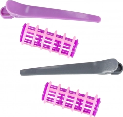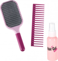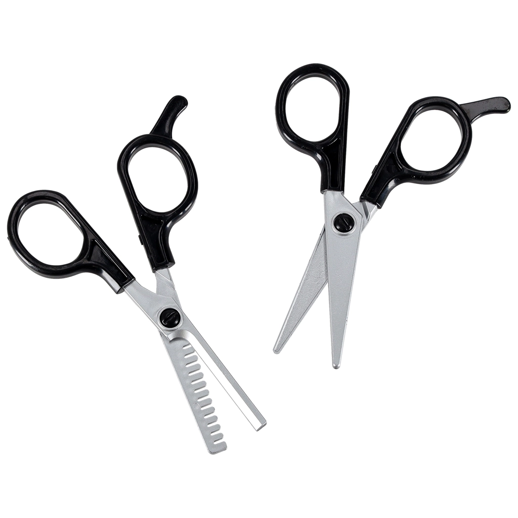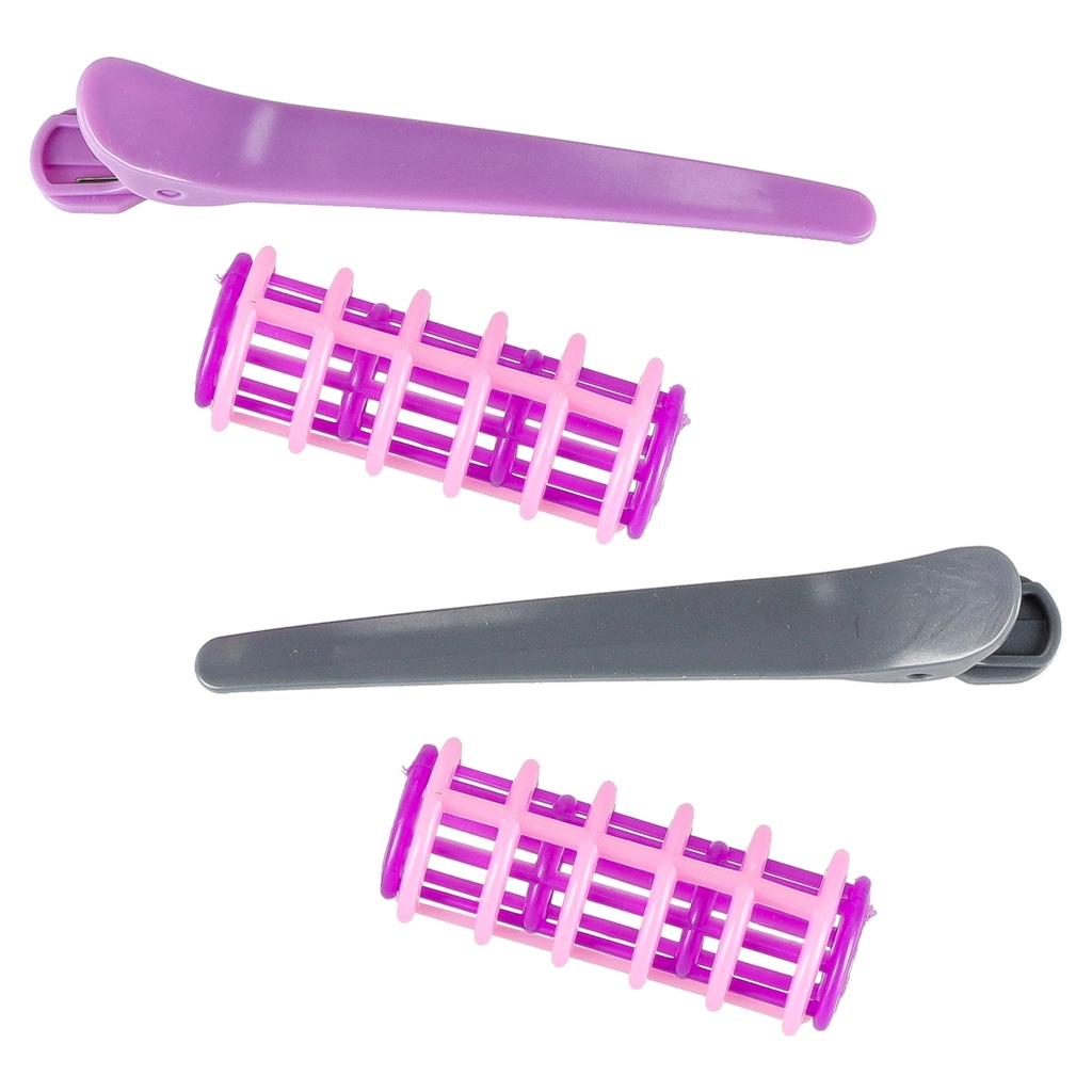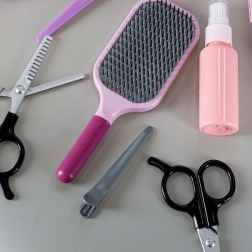 Brosse, peigne, ciseaux sans lames tranchantes, ciseaux effileurs, bigoudis, pinces et flacon vide – l’équipement complet pour des scénarios de coiffure au quotidien.