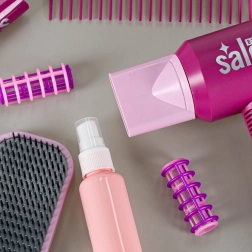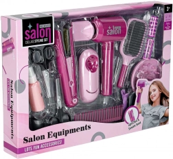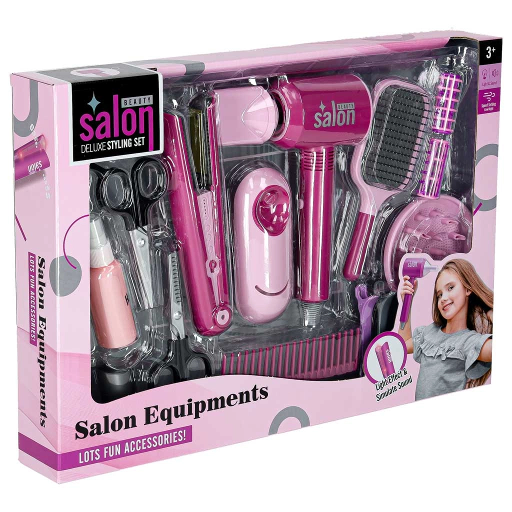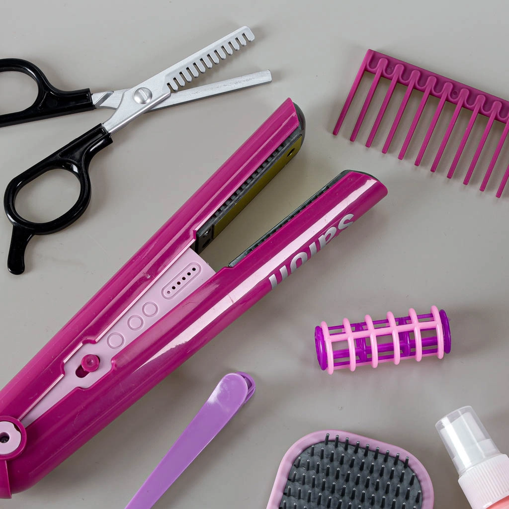 Le coffret comprend tout pour une transformation complète : sèche-cheveux avec deux embouts (concentrateur et diffuseur), lisseur pour enfants avec support, brosse et peigne, 2 types de ciseaux aux bords non tranchants, bigoudis et pinces ainsi qu’un flacon vide pour le « styling ». L’ensemble est léger, robuste et sûr pour les enfants à partir de 3 ans.