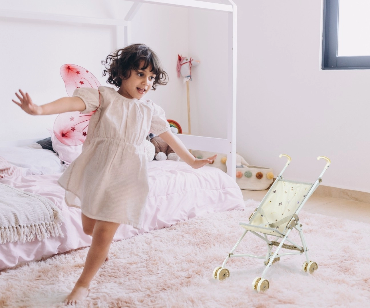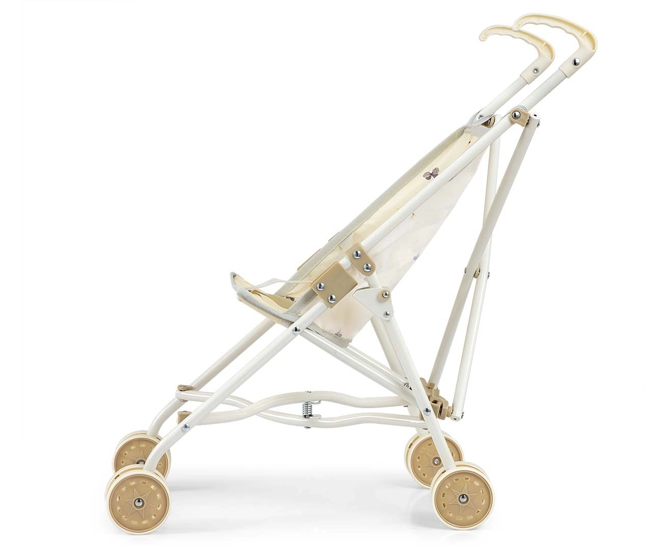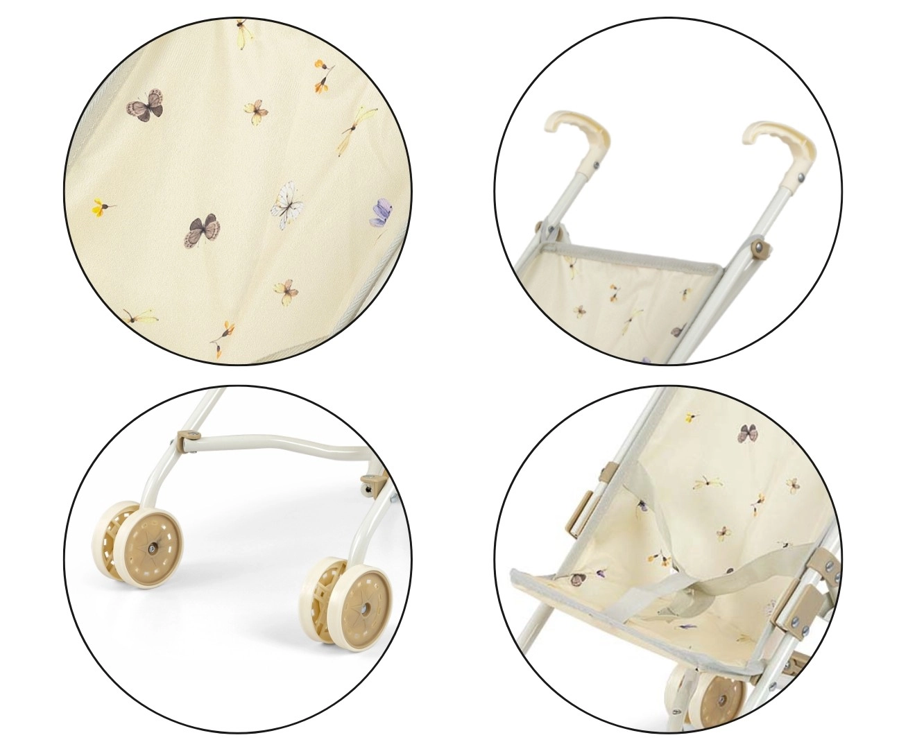 Grâce à son pliage canne rapide, la poussette se range facilement à plat, sans prendre de place à la maison ni en déplacement. Le châssis métallique assure la solidité, les roues doubles offrent une conduite fluide et la ceinture de sécurité maintient la poupée bien en place.