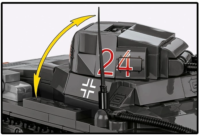 Tourelle rotative à 360°, armement ajustable et chenilles réalistes avec roues permettent des scènes dynamiques, un mouvement fluide et une présentation attrayante du modèle.