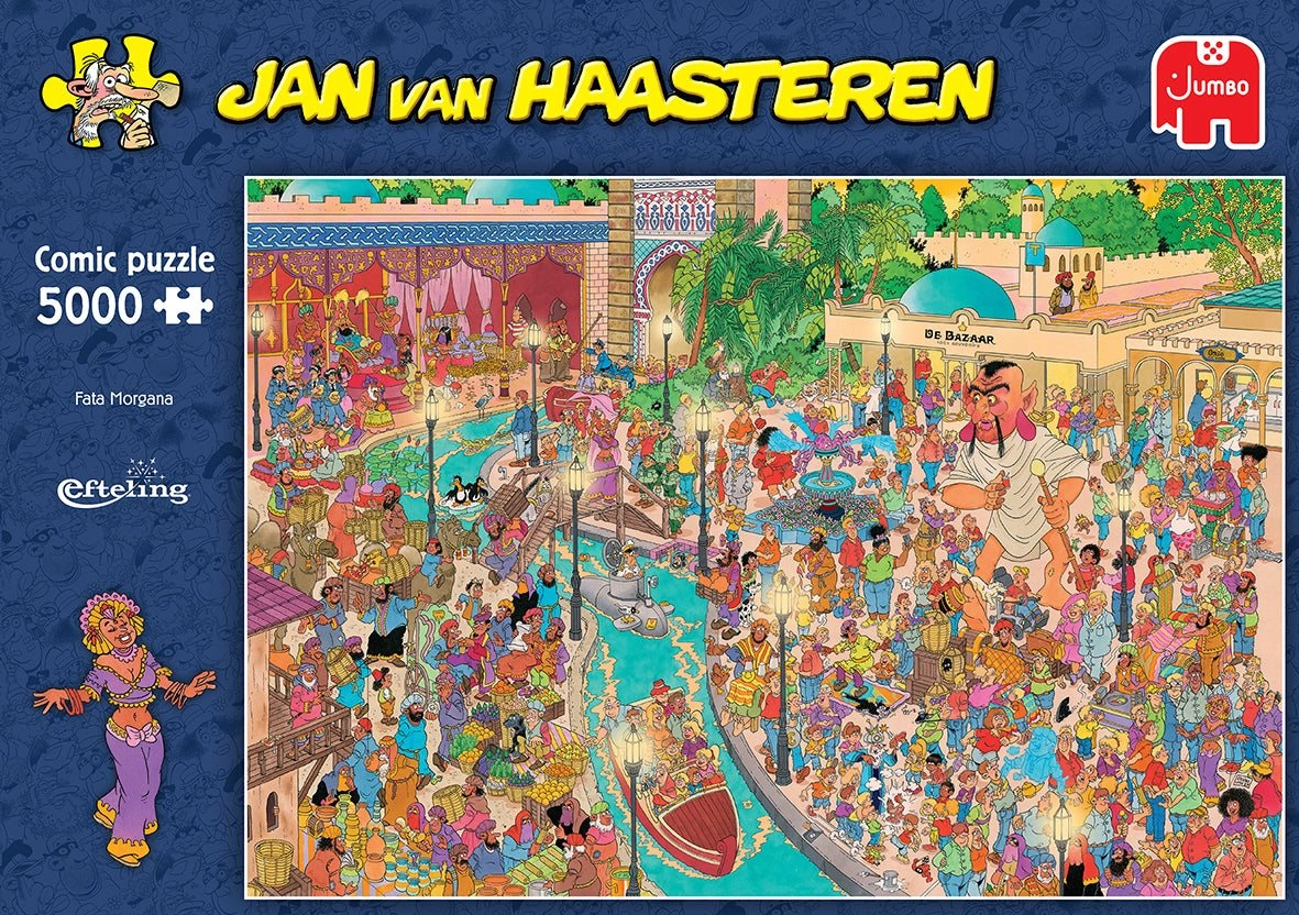 Plongez dans le chaos coloré et l’univers ludique de l’illustrateur Jan van Haasteren. Ce grand puzzle au motif Fata Morgana du parc d’attractions Efteling est un choix idéal pour les amateurs de défis comme pour les collectionneurs. Chaque centimètre de l’illustration regorge de gags et des « signatures » de l’auteur – de la nageoire de requin à Saint-Nicolas, jusqu’à l’autoportrait de l’artiste.