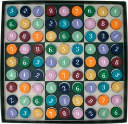 - 81 pions de jeu en bois (9 de chaque couleur/chiffre), plateau 9×9, règles avec grilles de départ