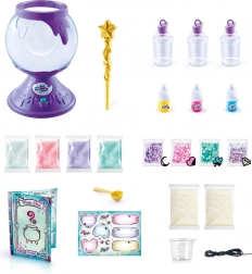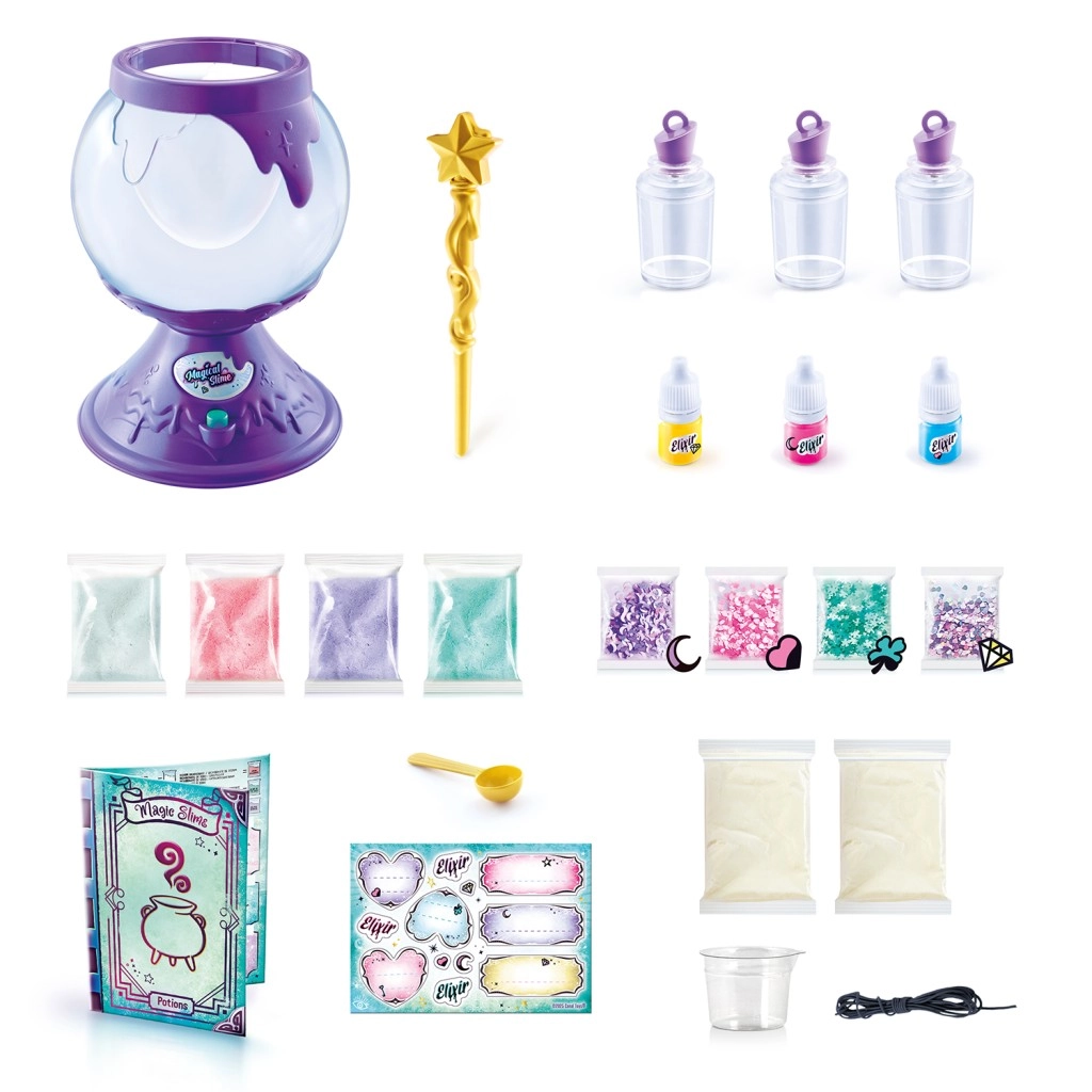 Le coffret comprend des poudres à slime, 3 élixirs, 4 décorations, un doseur, des recettes et 3 flacons – tout ce qu’il faut aux enfants pour leurs propres mélanges magiques.