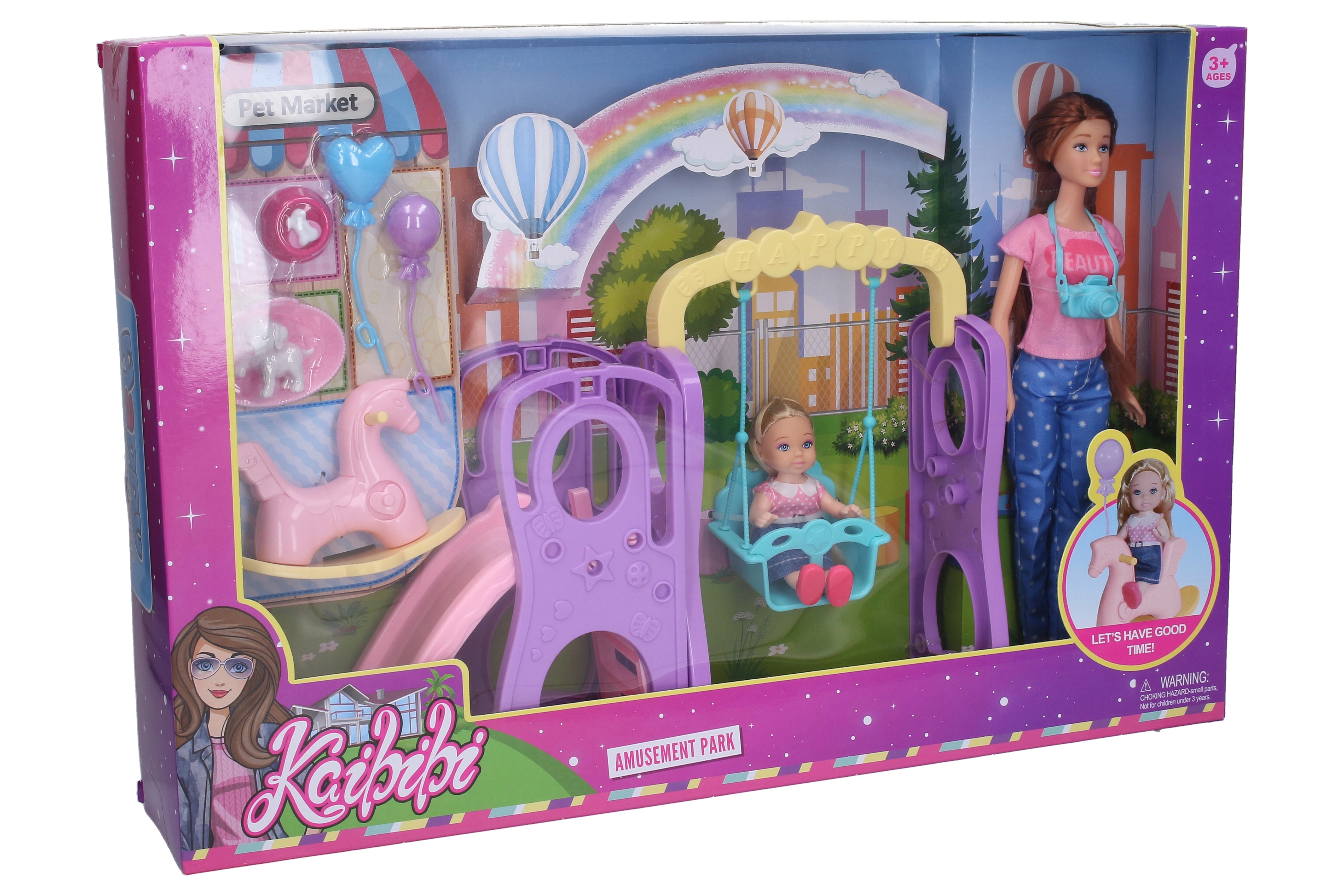Poupée, fillette, balançoire, toboggan, cheval à bascule, chiot et accessoires