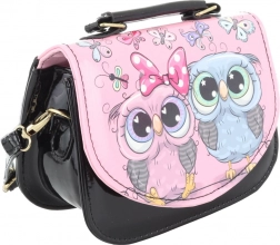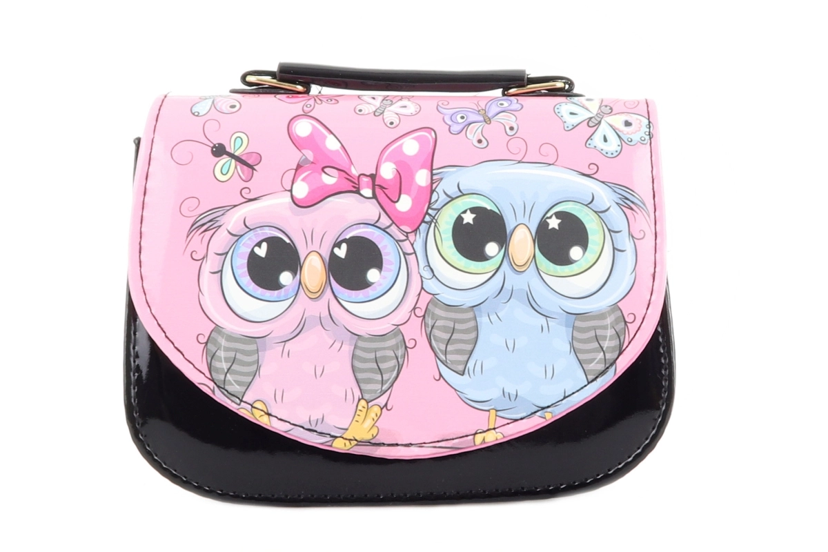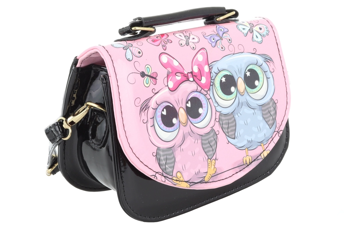 Adorable petit sac pour enfant avec motif de hiboux, idéal pour les petites coquettes. Dimensions compactes et base noire brillante, complétées par un rabat coloré imprimé de hiboux et de papillons, en font un accessoire stylé au quotidien. Il offre une anse confortable, une fermeture pratique et convient aux enfants à partir de 3 ans.