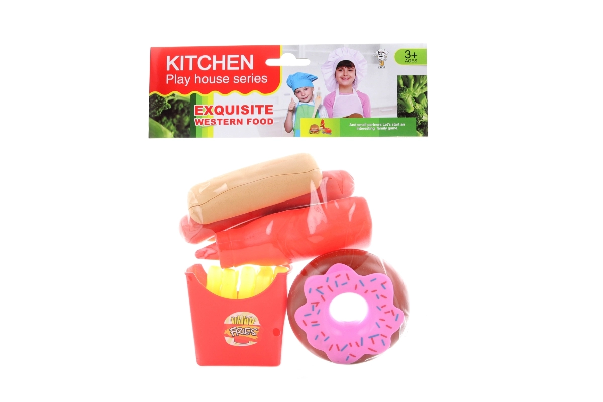 Amusant set en plastique pour petits chefs avec des friandises populaires – hot-dog, frites en boîte, donut et ketchup. Idéal pour le jeu de cuisine, le développement de l’imagination et de la motricité fine. Emballé dans un sachet, recommandé dès 3 ans.