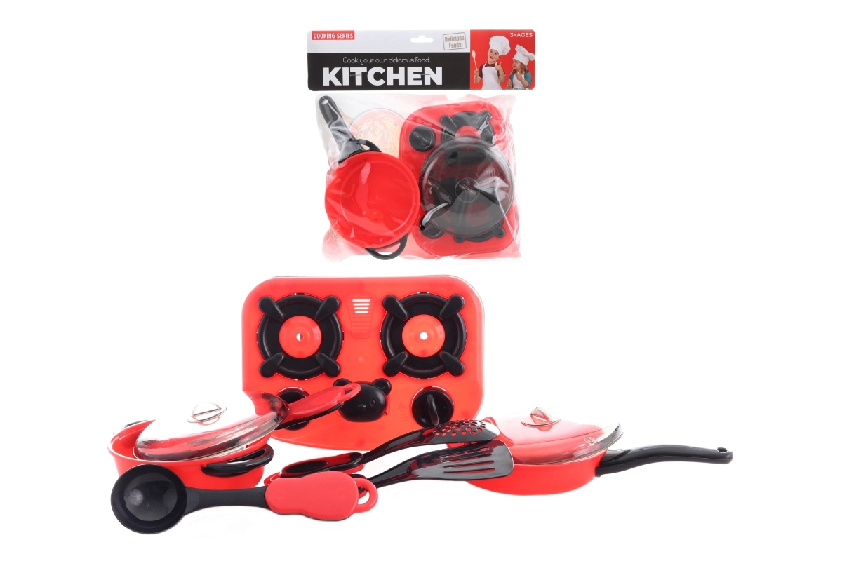 Set de jeu pour cuisine enfant destiné aux petits cuisiniers et cuisinières. Contient un réchaud, une casserole, une poêle et une spatule. Jouet léger et sûr pour les enfants à partir de 3 ans, pratiquement emballé dans un sachet.