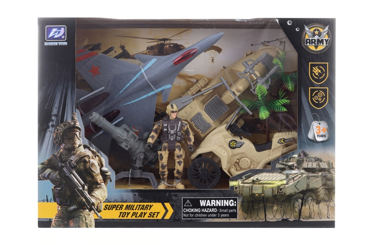 Amusant coffret militaire pour petits aventuriers comprenant un soldat, un avion de chasse, une moto, un scooter des mers et de petits accessoires. Idéal pour un jeu créatif et le développement de l’imagination. Fabriqué en plastique résistant, emballé dans une boîte pratique. Accessoires variés, matériau durable et excellent cadeau pour les enfants dès 3 ans.