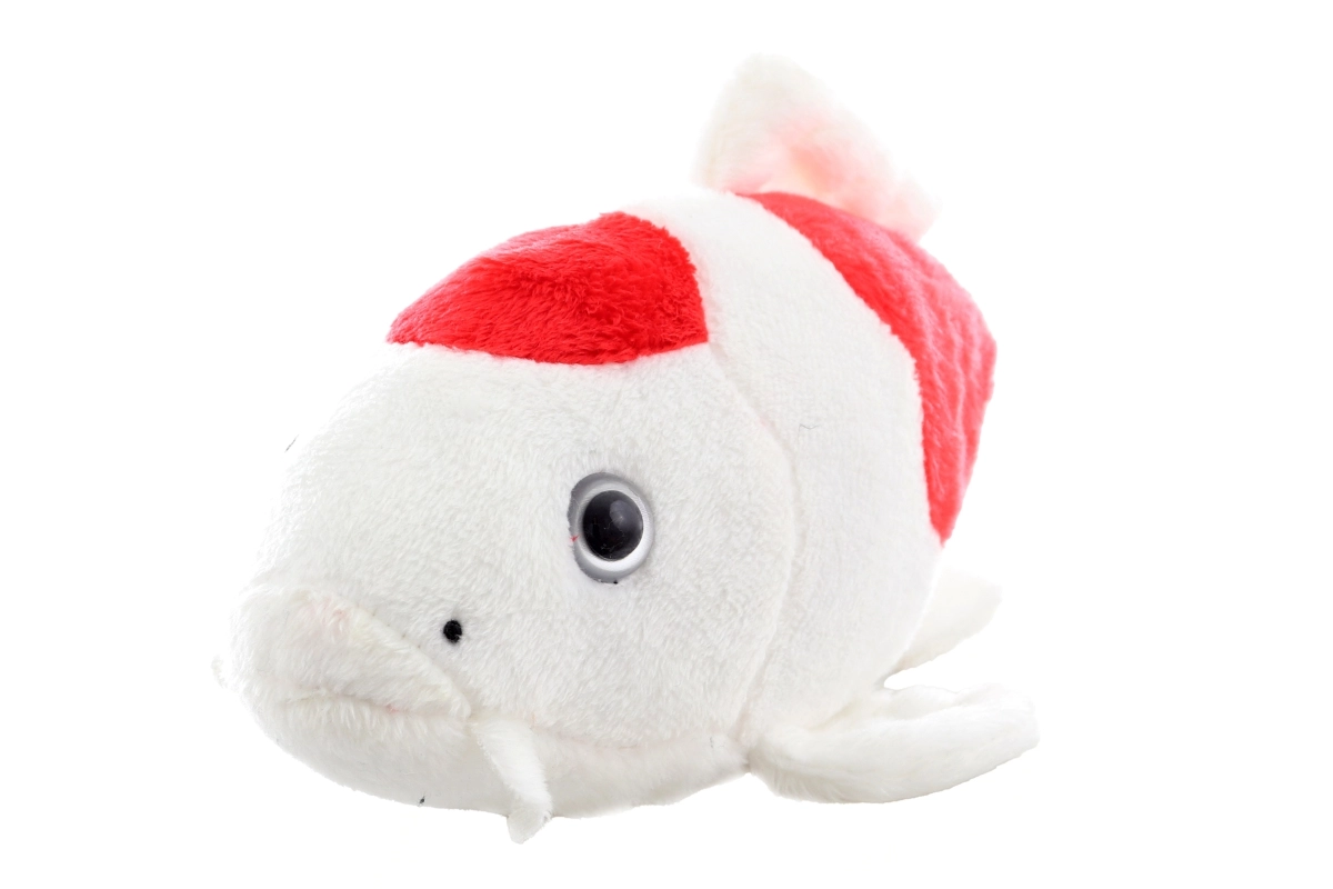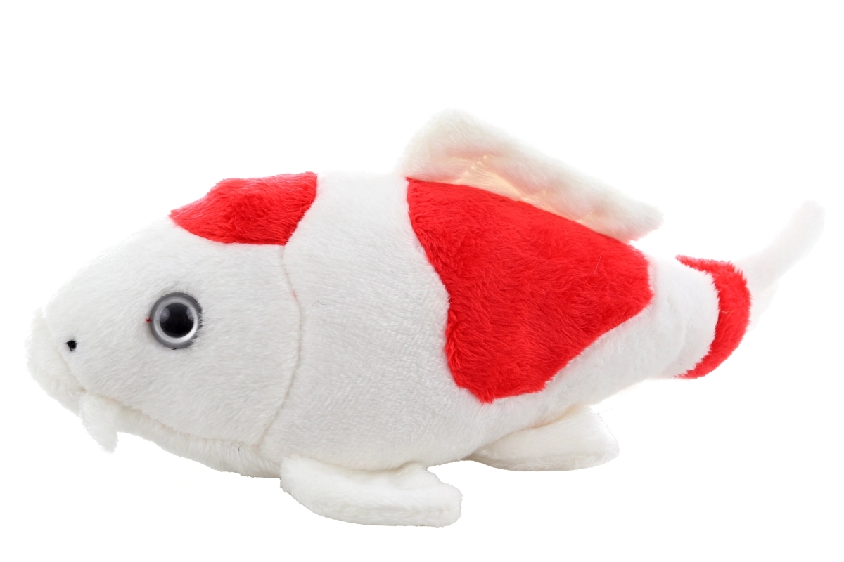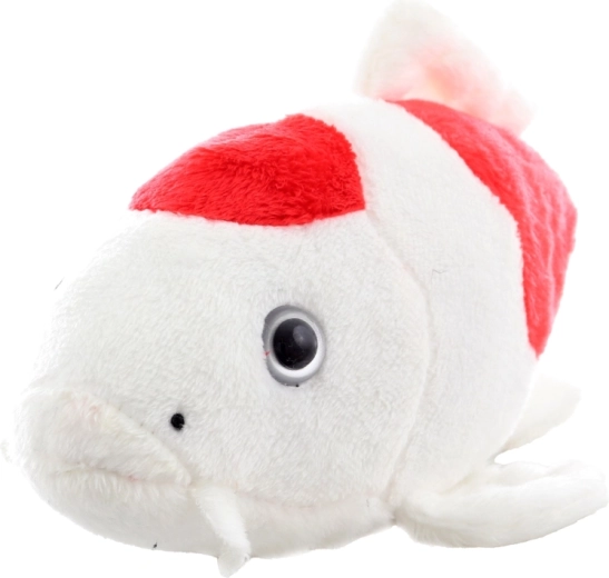 Coloris blanc et rouge, petites nageoires et œil expressif donnent à la peluche un aspect mignon et vivant.
