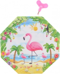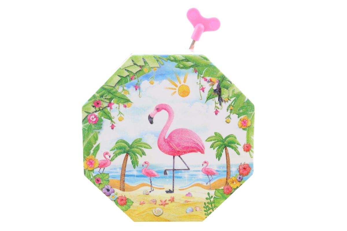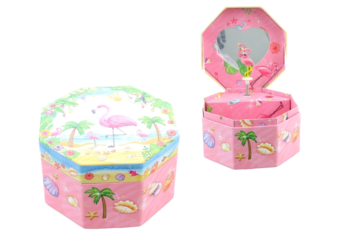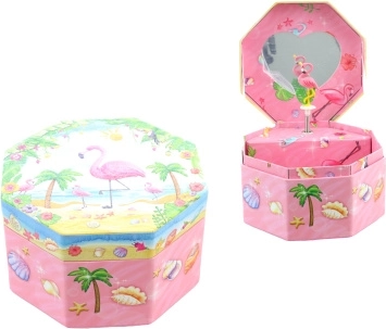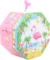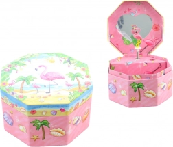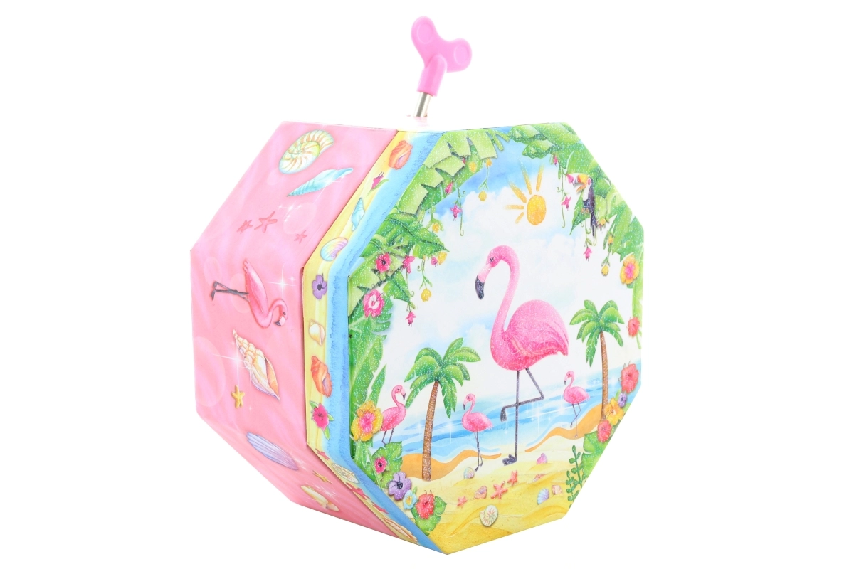 Cette charmante boîte à bijoux musicale de couleur rose se distingue par sa forme octogonale et son motif tropical avec flamant rose, palmiers et coquillages. À l’ouverture apparaît un flamant dansant devant un miroir en forme de cœur ; il se met à tourner après remontage de la clé et accompagne le rangement des bijoux d’une douce mélodie.