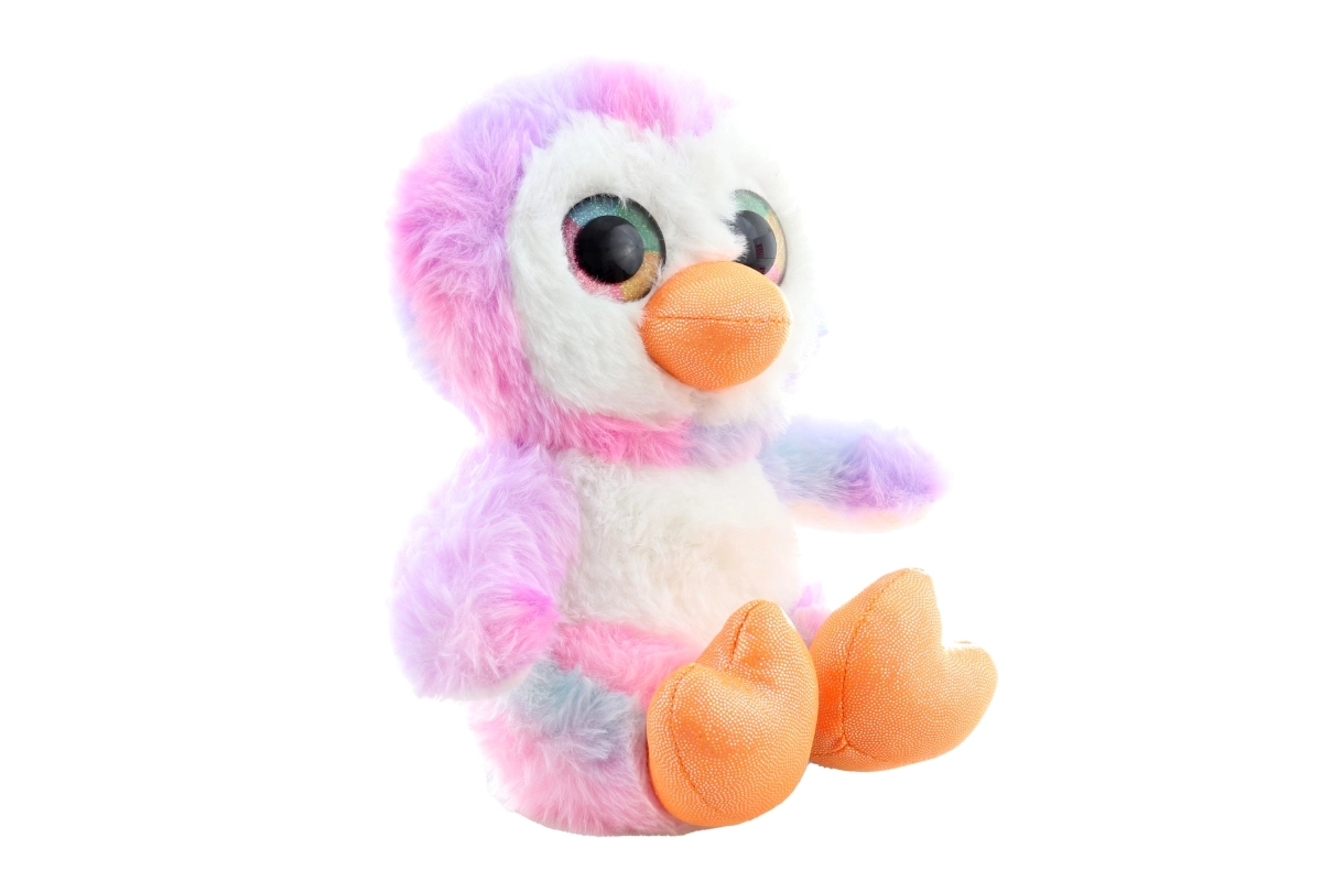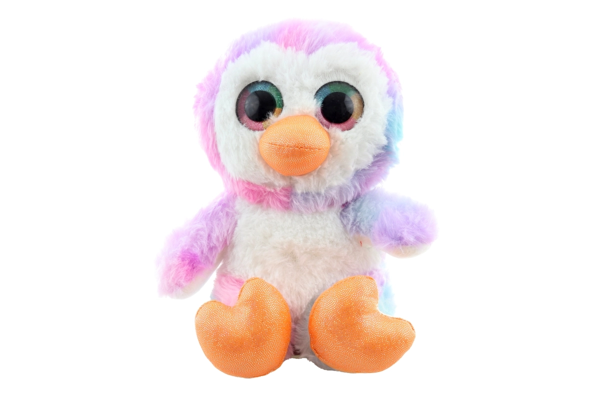 De grands yeux scintillants et des tons pastel délicats (rose, violet, bleu et blanc) font de ce manchot un adorable accessoire pour la chambre d’enfant.