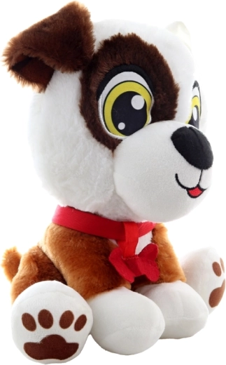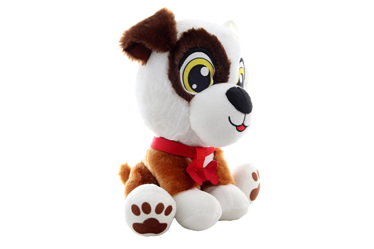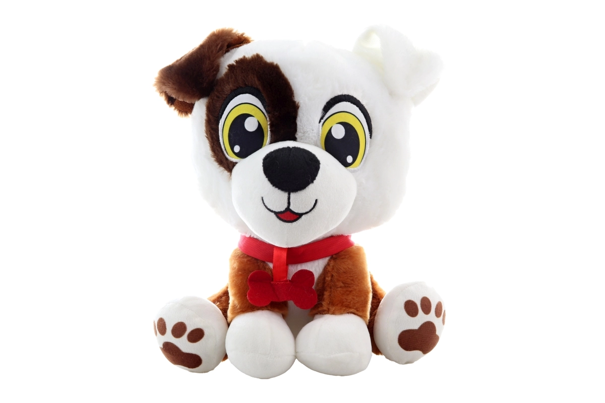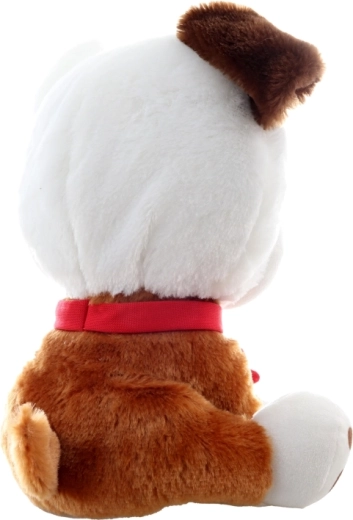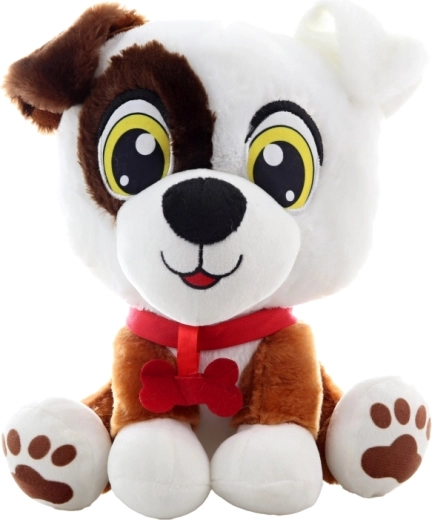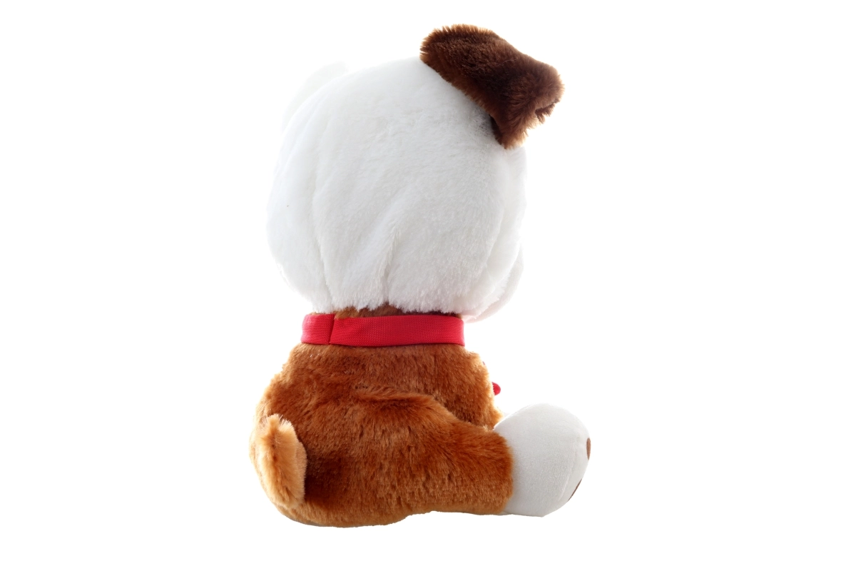 Ce chien en peluche tout doux, combinant les couleurs blanche et marron, est fait pour les câlins. Il possède des détails de visage brodés, des pattes imprimées et un collier rouge avec nœud et os, lui donnant une apparence amicale et enjouée. Il est sûr pour les très jeunes enfants et s’intègre parfaitement dans le lit ou la chambre d’enfant comme décoration.