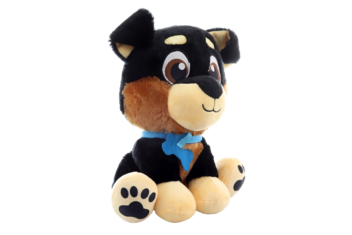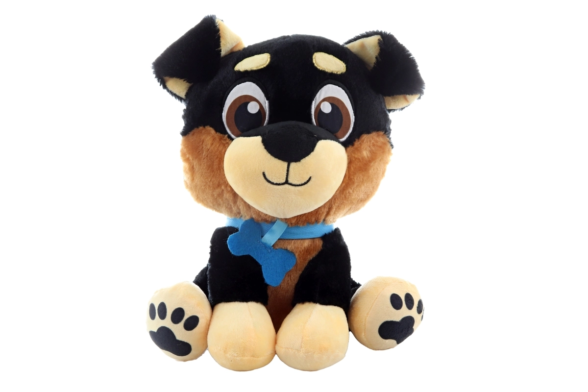 Sa conception sûre sans petites pièces, ses coutures résistantes et sa matière moelleuse en font un compagnon parfait pour les bébés comme pour les plus grands. Son collier bleu stylé et ses pattes imprimées apportent une touche de personnalité au jouet.
