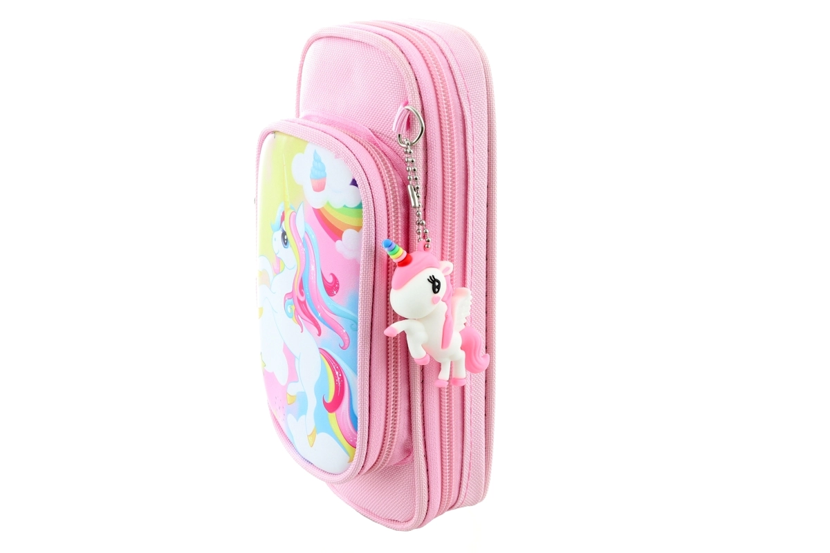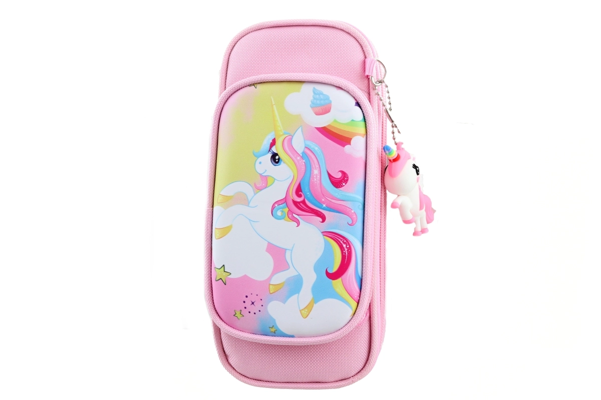 Adorable trousse rose au motif de licorne qui ravira chaque écolière. Elle offre deux compartiments zippés pour un rangement clair des fournitures et des petits objets, et est ornée d’un pendentif licorne et d’un imprimé coloré. Sa conception textile souple et ses dimensions compactes garantissent un transport confortable même dans un petit sac à dos.