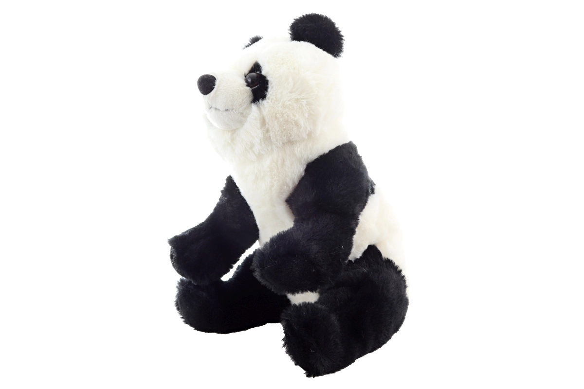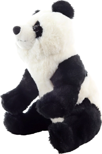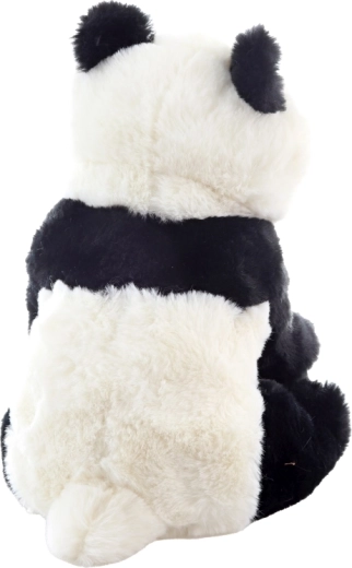 Les yeux en plastique, les oreilles rondes et les coutures soignées complètent l'apparence réaliste du panda en position assise.