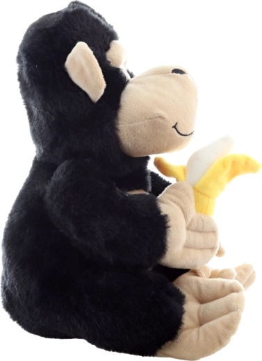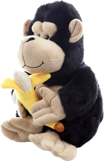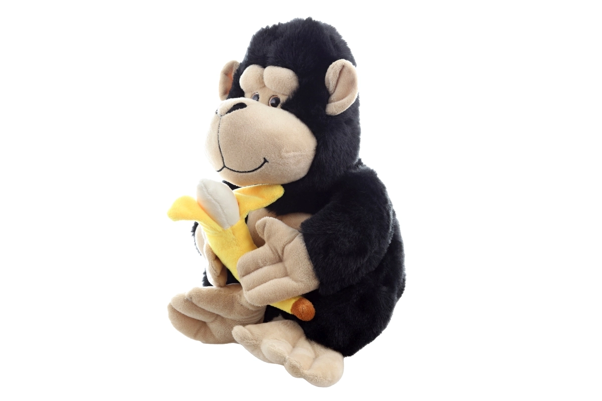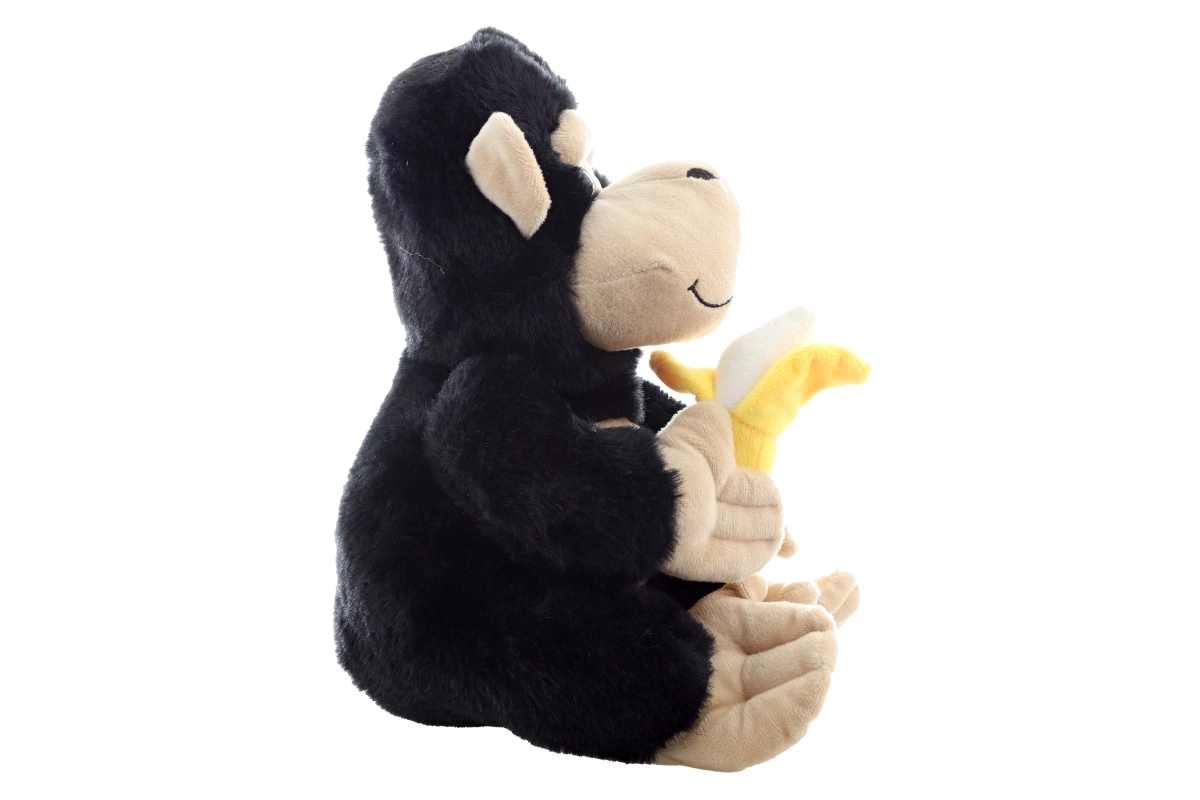 Cette gorille en peluche de 28 cm séduit au premier regard par sa fourrure noire toute douce et son visage, ses pattes et ses pieds beige en contraste. Elle tient fièrement dans ses pattes une banane jaune toute moelleuse – un adorable accessoire qui invite au jeu imaginatif et à raconter des histoires.