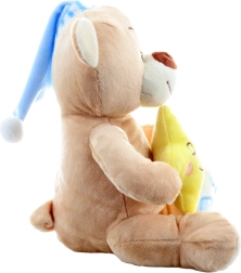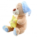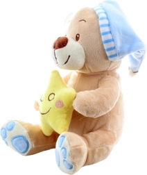 Ce tendre ourson en peluche avec bonnet bleu apporte aux enfants une sensation de calme et de sécurité. La petite étoile jaune entre ses pattes accompagne les rituels apaisants du coucher, tandis que les matières douces invitent aux câlins. Grâce aux yeux et au sourire brodés, le jouet convient même aux tout-petits.