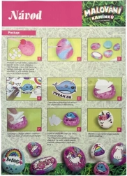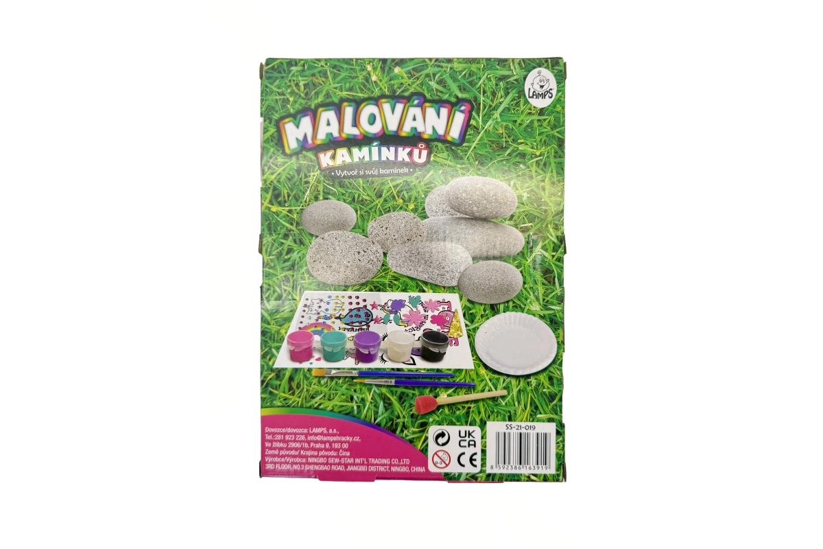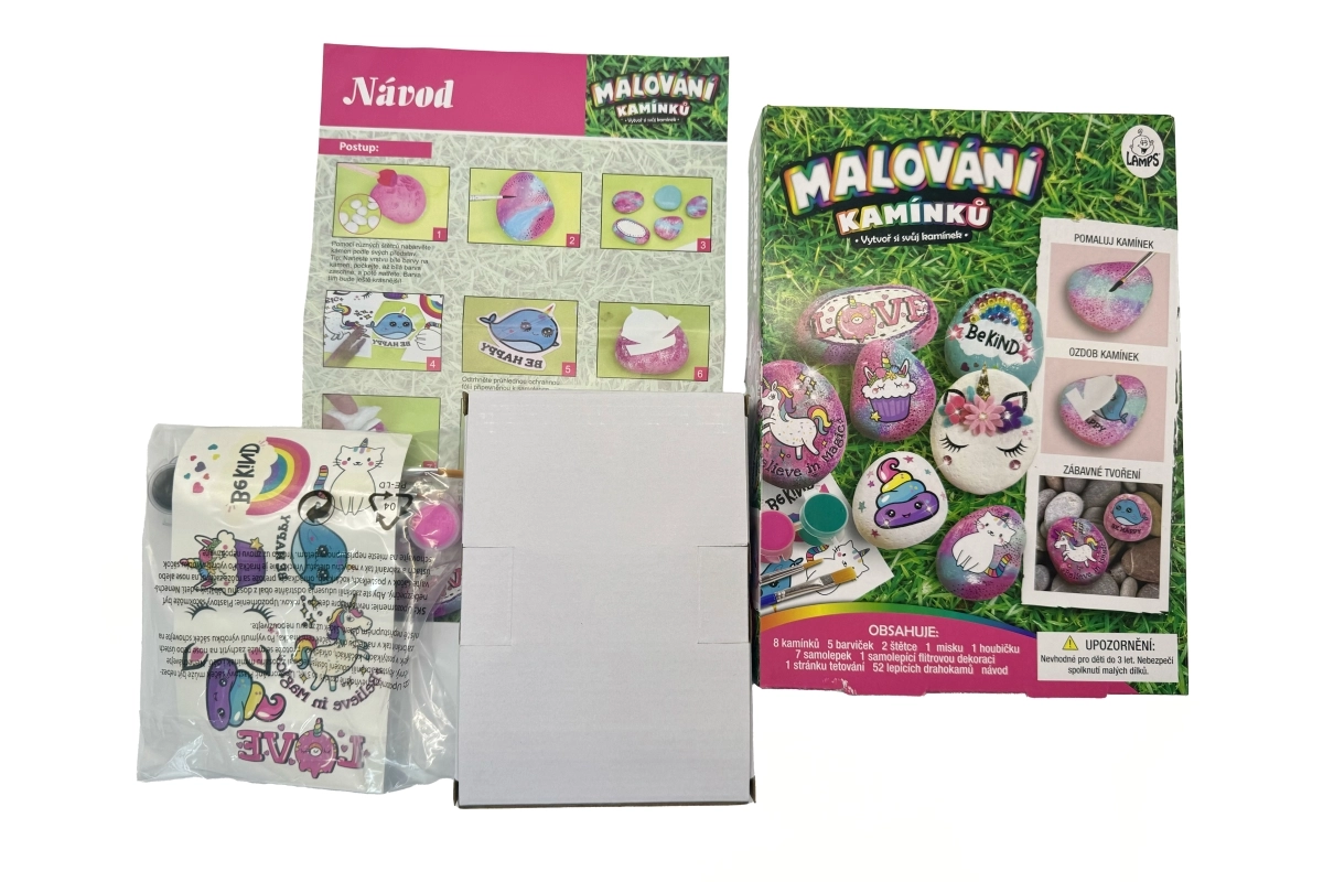 Le kit comprend 8 galets, 5 pots de peinture, 2 pinceaux, 52 gemmes autocollantes et d’autres accessoires. Grâce aux gobelets de peinture facilement refermables et au tampon en mousse, le travail est plus propre et plus précis. Dimensions de l’emballage env. 18 × 25 × 5 cm. Âge : 3+.