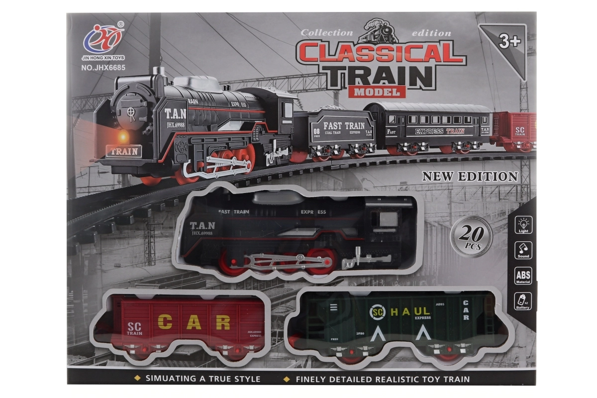 La boîte contient tout le nécessaire pour s’amuser immédiatement : une locomotive, 2 wagons, un ensemble de rails pour créer une voie circulaire et des autocollants décoratifs. L’alimentation est assurée par 2× piles AA (non incluses). L’ensemble est rangé de manière claire dans une boîte et, grâce à ses dimensions compactes, se stocke facilement.