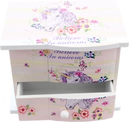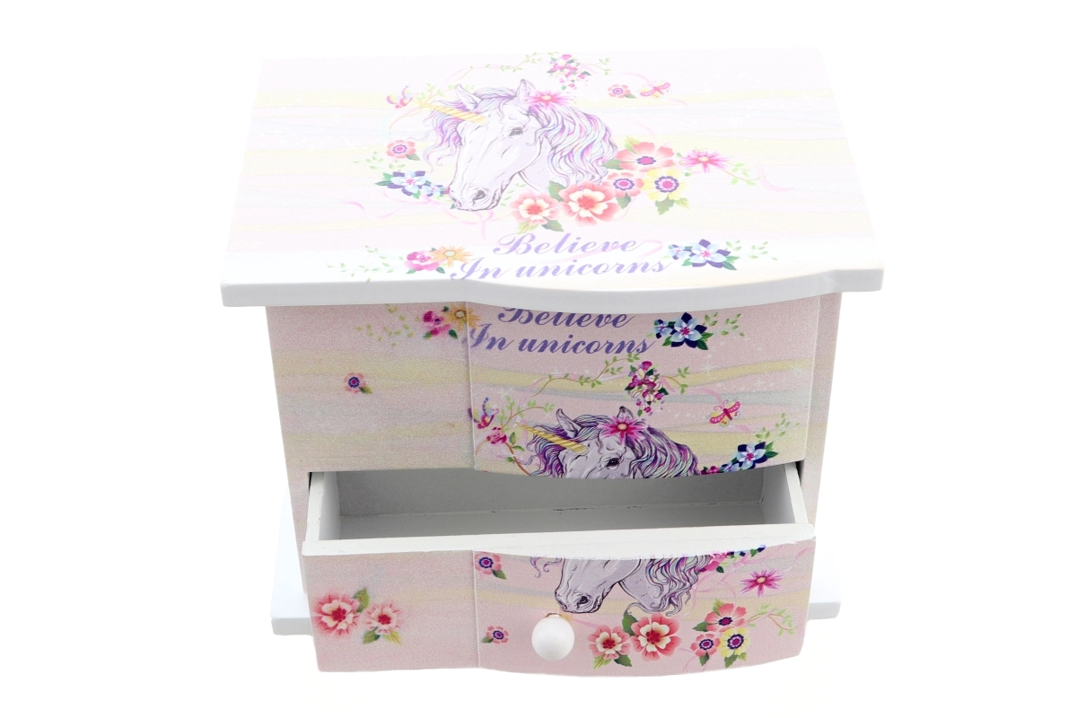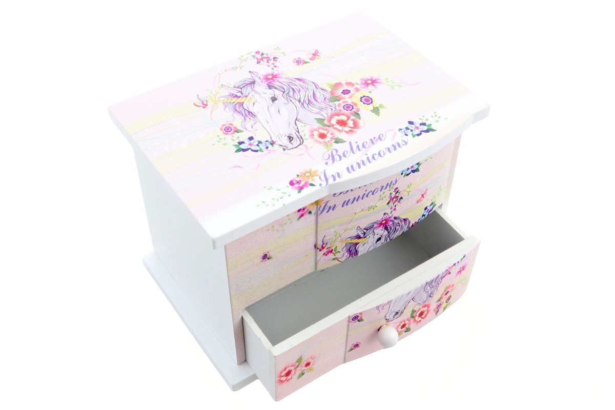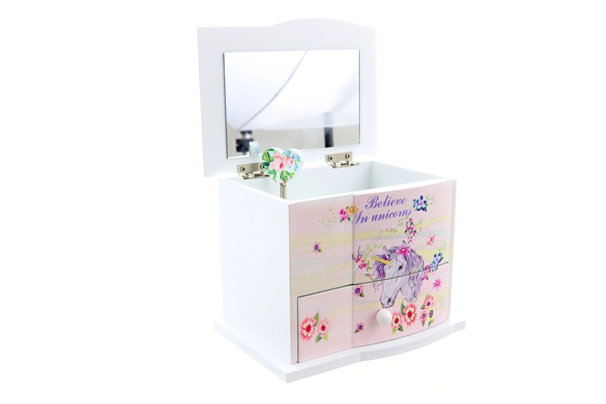 Cette charmante boîte à bijoux en bois au motif licorne protège à merveille les trésors des enfants – bagues, bracelets et petits secrets. À l’ouverture du couvercle, un cœur se met à tourner et une douce musique se fait entendre, pour un sourire garanti à chaque utilisation. La partie supérieure cache un miroir pratique pour essayer rapidement les bijoux, et en bas se trouve un tiroir pour d’autres petites affaires.