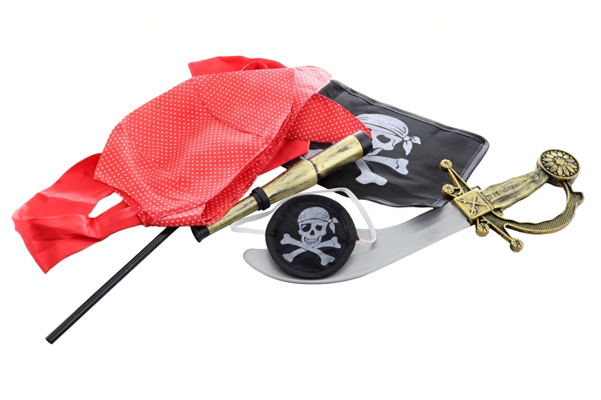 - Manteau, short, sabre, drapeau de pirate, bandana, ceinture, cache-œil