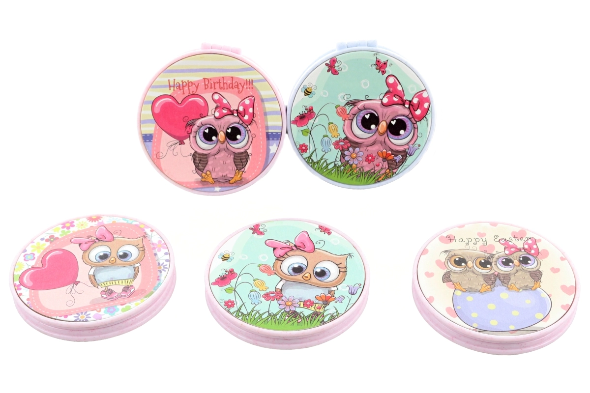 Le miroir possède un étui en plastique avec de jolis imprimés de hiboux et, une fois ouvert, offre deux surfaces miroir pour des retouches rapides du maquillage ou des cheveux. Livré en plusieurs motifs selon la disponibilité en stock. Emballé en sachet.