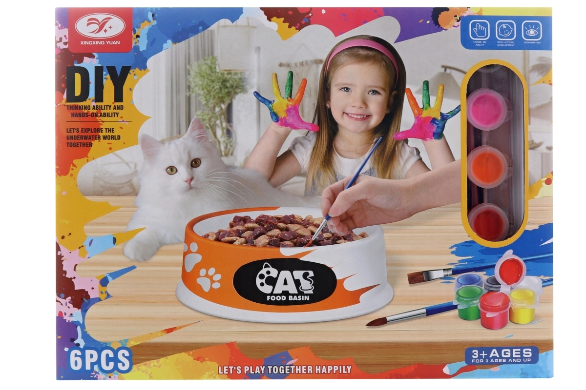Le kit comprend 6 couleurs, 2 pinceaux et une palette de peinture, permettant aux enfants de combiner les couleurs, de mélanger les nuances et de créer des motifs originaux. Le bol fini est non seulement beau, mais aussi fonctionnel comme gamelle pour la nourriture ou l’eau du chat.