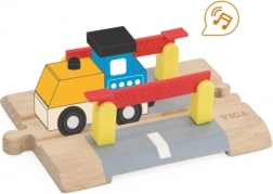 La construction en bois robuste garantit une longue durée de vie et un jeu en toute sécurité. Les terminaisons compatibles permettent une connexion aisée avec la plupart des systèmes de rails et de routes en bois. L’alimentation par 2 piles bouton apporte des effets attrayants qui stimulent l’imagination et la concentration.
