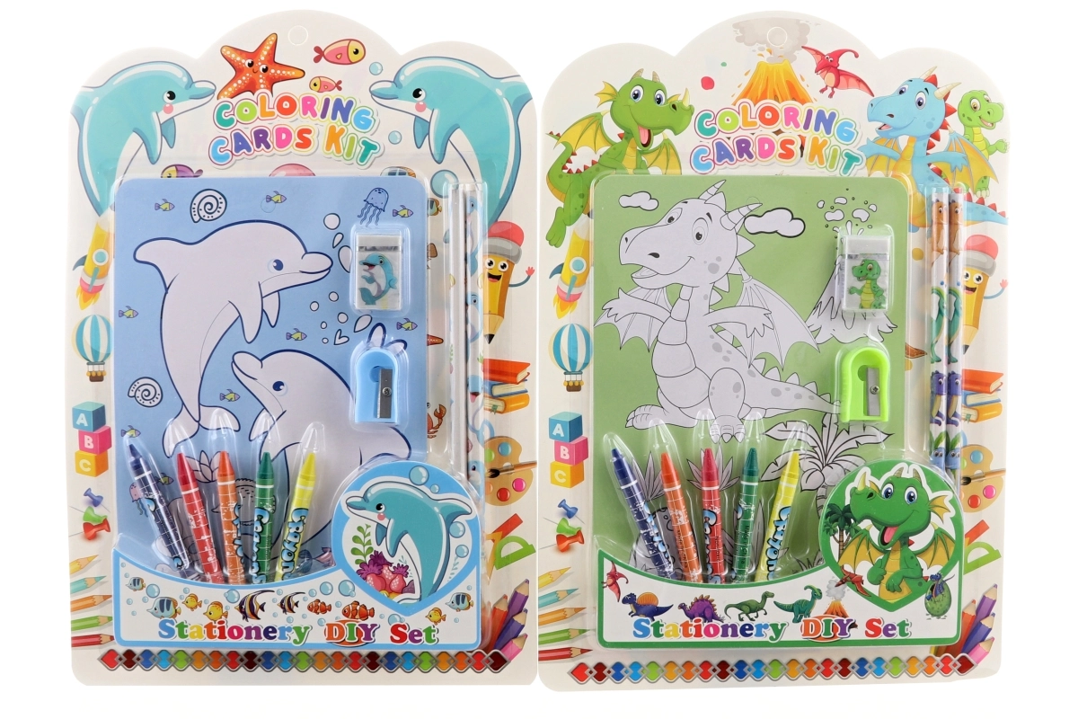 - Livre de coloriage, crayons de couleur, gomme, taille-crayon, 2 crayons à papier