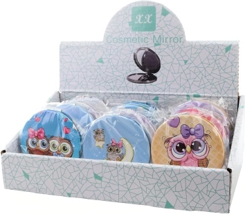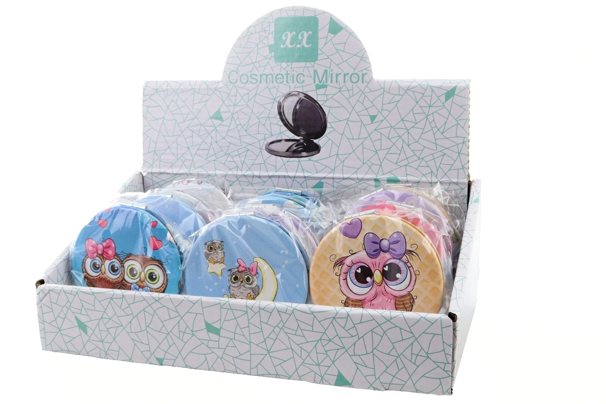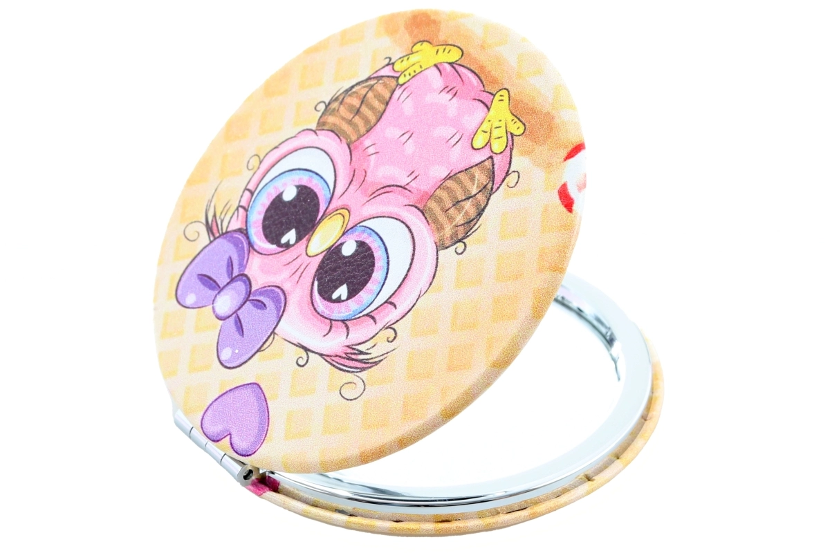 Une fois ouvert, vous trouverez un double miroir – pratique pour les retouches détaillées du maquillage ou un contrôle rapide de la coiffure au cours de la journée. Les miroirs sont proposés en différents designs sur le thème des chouettes ; la variante exacte est sélectionnée selon la disponibilité en stock.