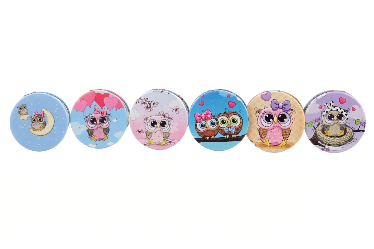 Adorable miroir de poche au motif de petites chouettes, idéal pour le sac à main ou le bagage de voyage. Il a un diamètre d’environ 7 cm et, une fois ouvert, offre un miroir des deux côtés pour une vérification rapide de l’apparence. Disponible en plusieurs designs – envoyé selon la disponibilité en stock. Emballé dans un sachet. Ce produit n’est pas un jouet.