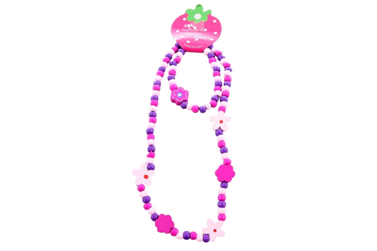 Adorable parure d’accessoires pour petites coquettes comprenant un collier et un bracelet en perles de bois à motif fleuri. Grâce à l’élastique, les bijoux sont confortables et ajustables, faciles à enfiler et tiennent bien en place. Idéals au quotidien et comme petit cadeau.