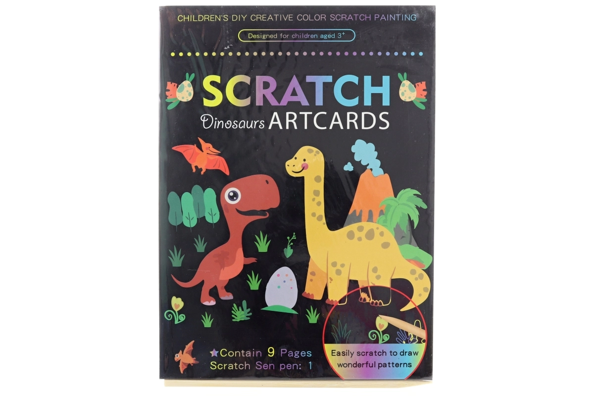Découvrez un loisir créatif avec des images à gratter sur le thème des dinosaures. Le coffret contient 9 images et un outil en bois pour gratter facilement. Chaque image mesure 14 × 19 cm. Idéal pour se détendre, développer la motricité fine et décorer. Ce produit n’est pas un jouet.