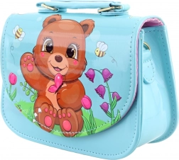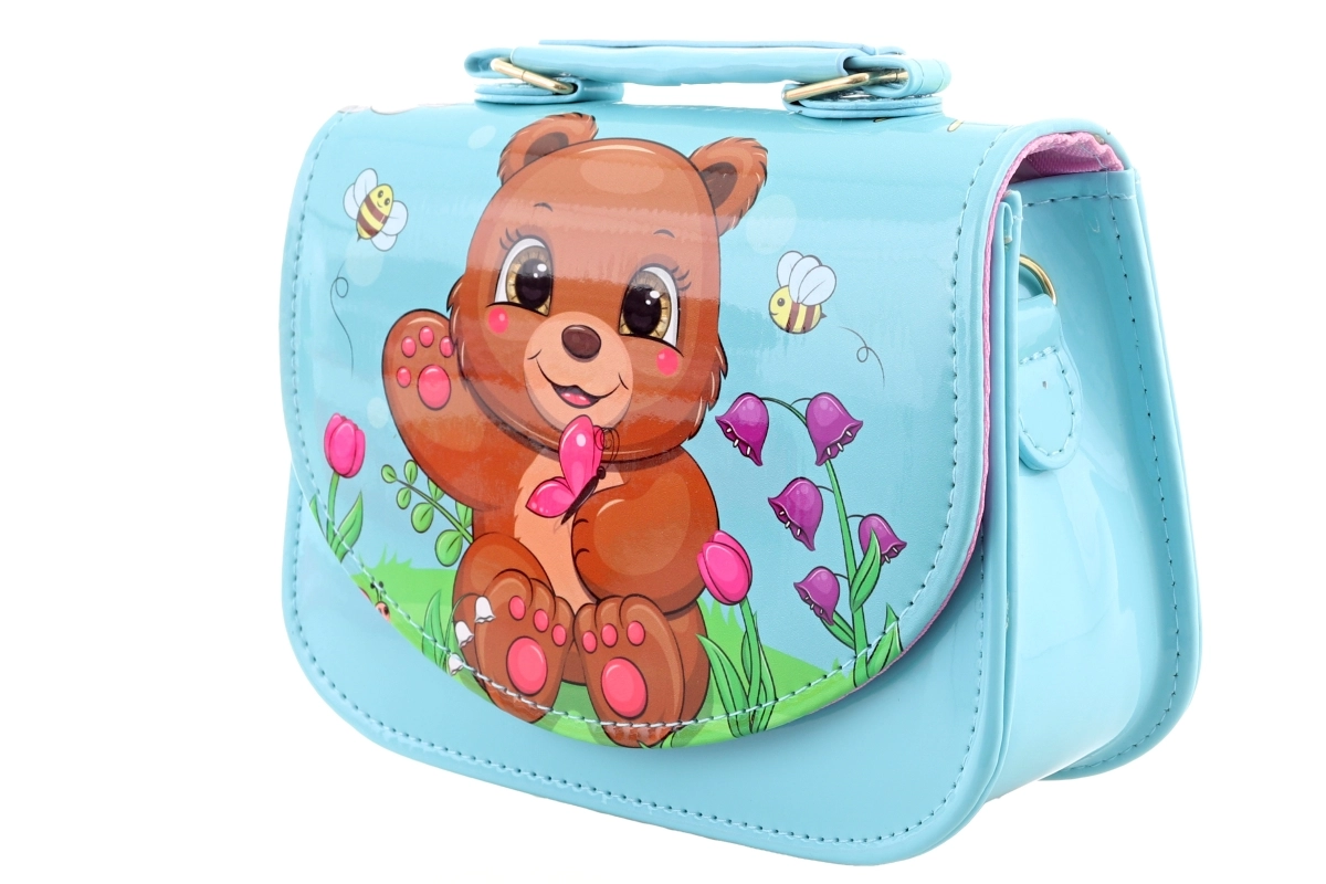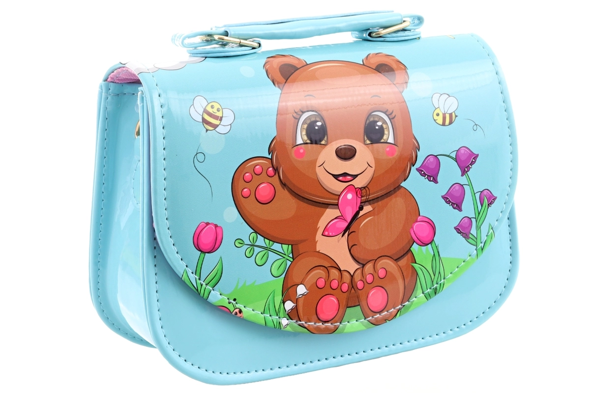 Adorable petit sac pour enfant de couleur bleu clair avec motif d’ourson, parfait pour les petites coquettes. Il possède une surface brillante, facile à nettoyer, une fermeture pratique à bouton-pression et un compartiment principal pour les petites affaires. Ses dimensions compactes 18 × 14 × 7 cm sont idéales pour des mouchoirs, de petits jouets ou des accessoires. Ce produit n’est pas un jouet.