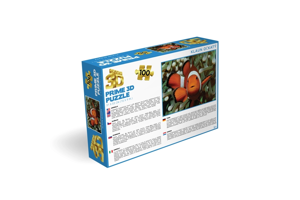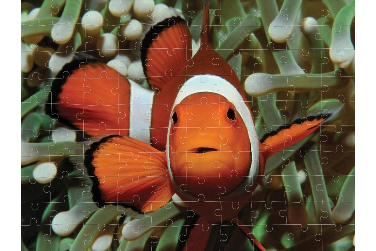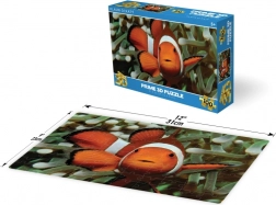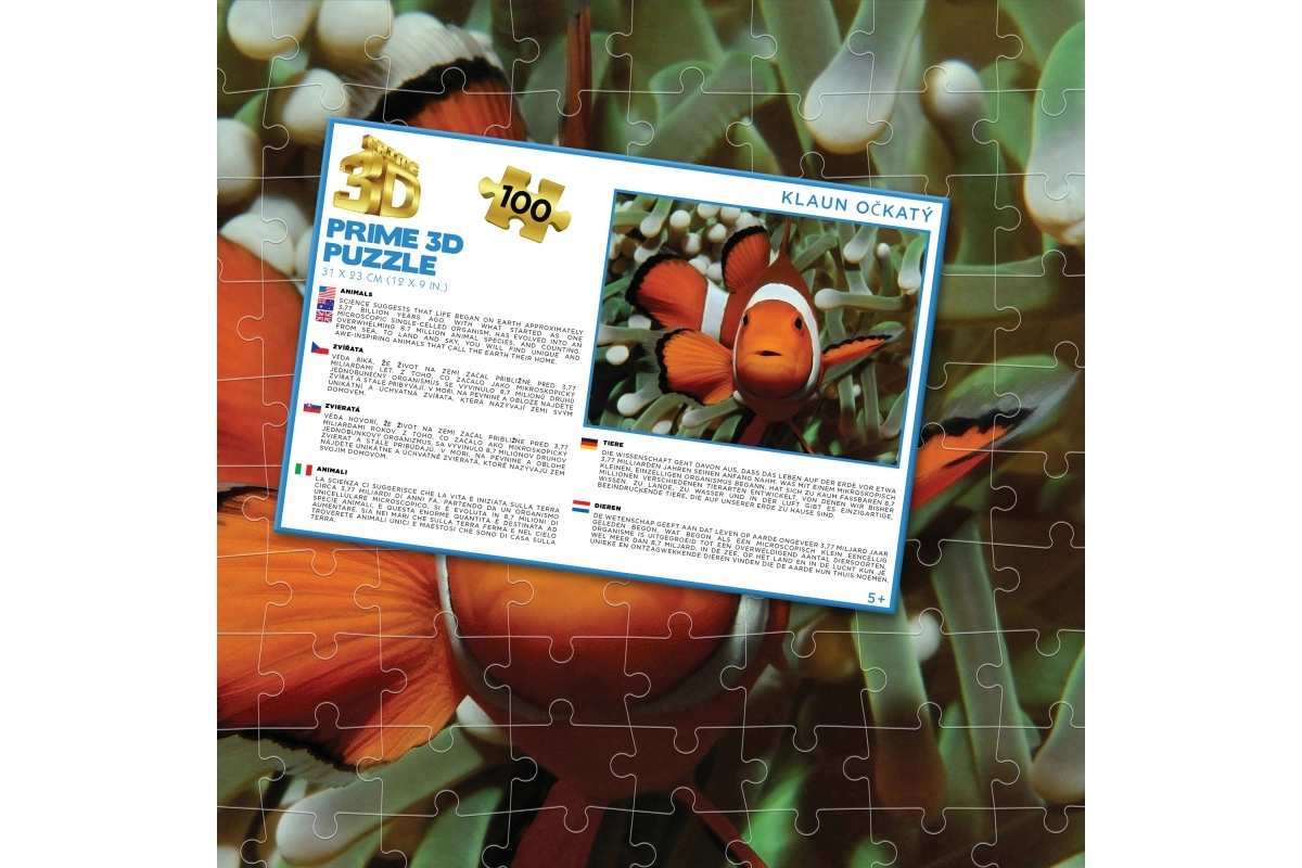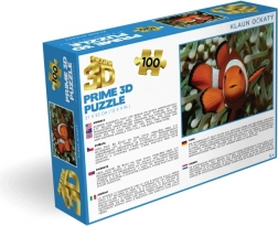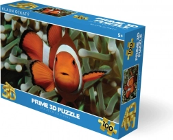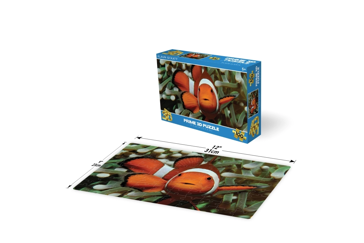 L’image lenticulaire 3D du poisson-clown séduit par sa profondeur et ses couleurs vives. La boîte claire indique le nombre de pièces et les dimensions pour un choix facile.