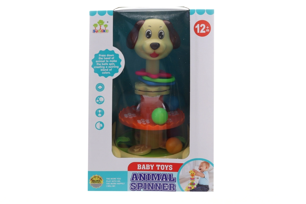 Cette adorable toupie au motif de petit chien ravira tous les petits explorateurs. D’une simple pression sur la tête, le mécanisme s’active et les billes colorées se mettent à tourner à l’intérieur. Le jouet favorise la coordination œil-main et apprend à l’enfant les relations de cause à effet.