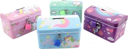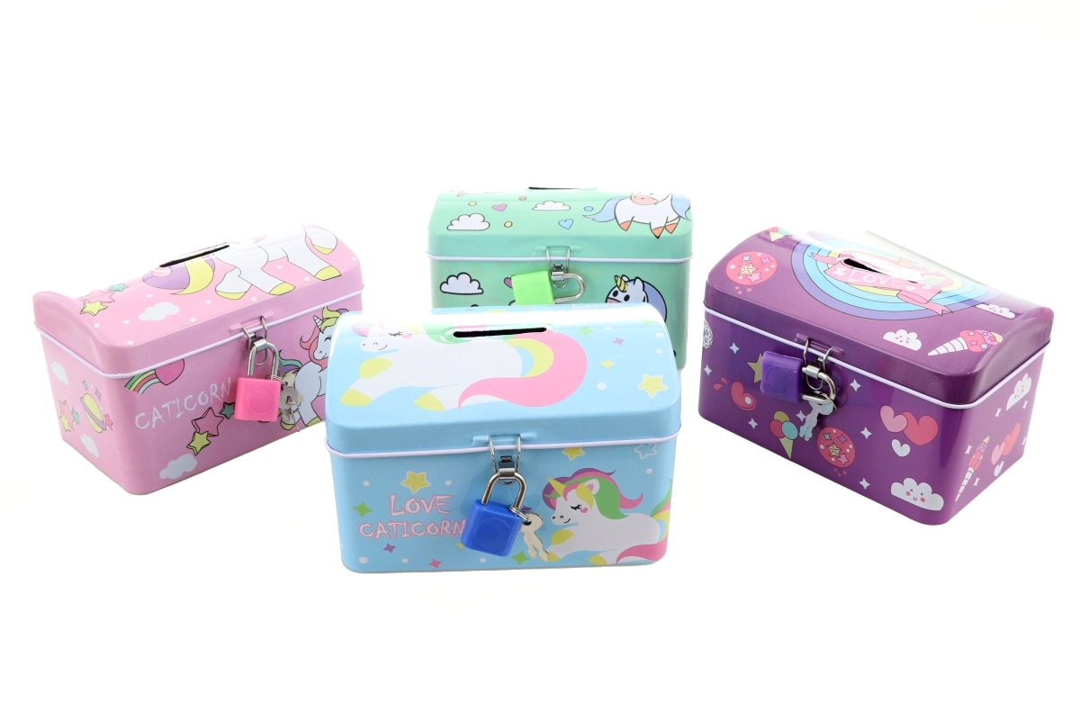 Adorable tirelire en métal au motif de licornes, idéale pour les premières économies des enfants. Livrée avec un cadenas et 2 clés pour ranger en toute sécurité pièces et petits trésors. Ses dimensions compactes 13 × 8 × 8 cm et sa fabrication robuste en font un excellent cadeau pour les enfants à partir de 3 ans.