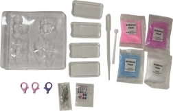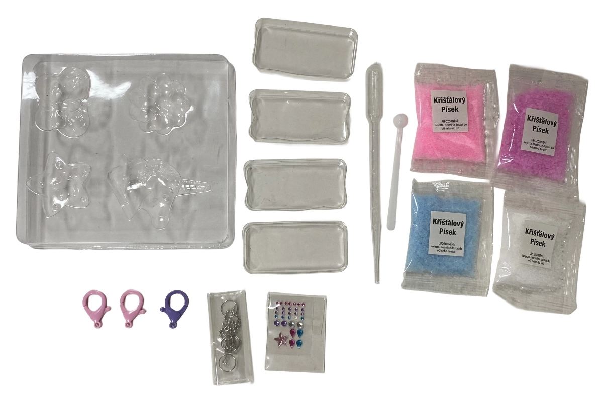 - Sable, moule, cuillère, pipette, strass autocollants, mousquetons, anneaux, épingles métalliques, chaîne à billes, récipients