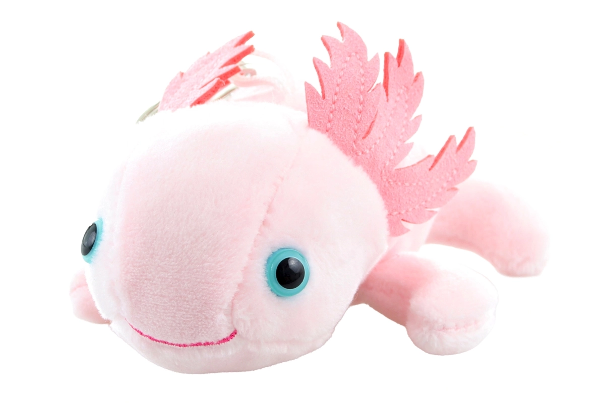 Matière toute douce, sourire brodé et franges branchiales décoratives font de l’axolotl un accessoire irrésistible.