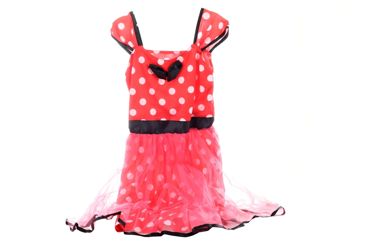 L’association du rouge à pois blancs, des bordures noires et du petit nœud à l’encolure confère à la robe le style iconique de Minnie.
